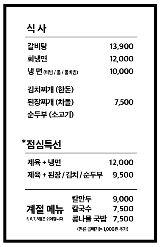 - (점심특선) : 제육+냉면 12,000원