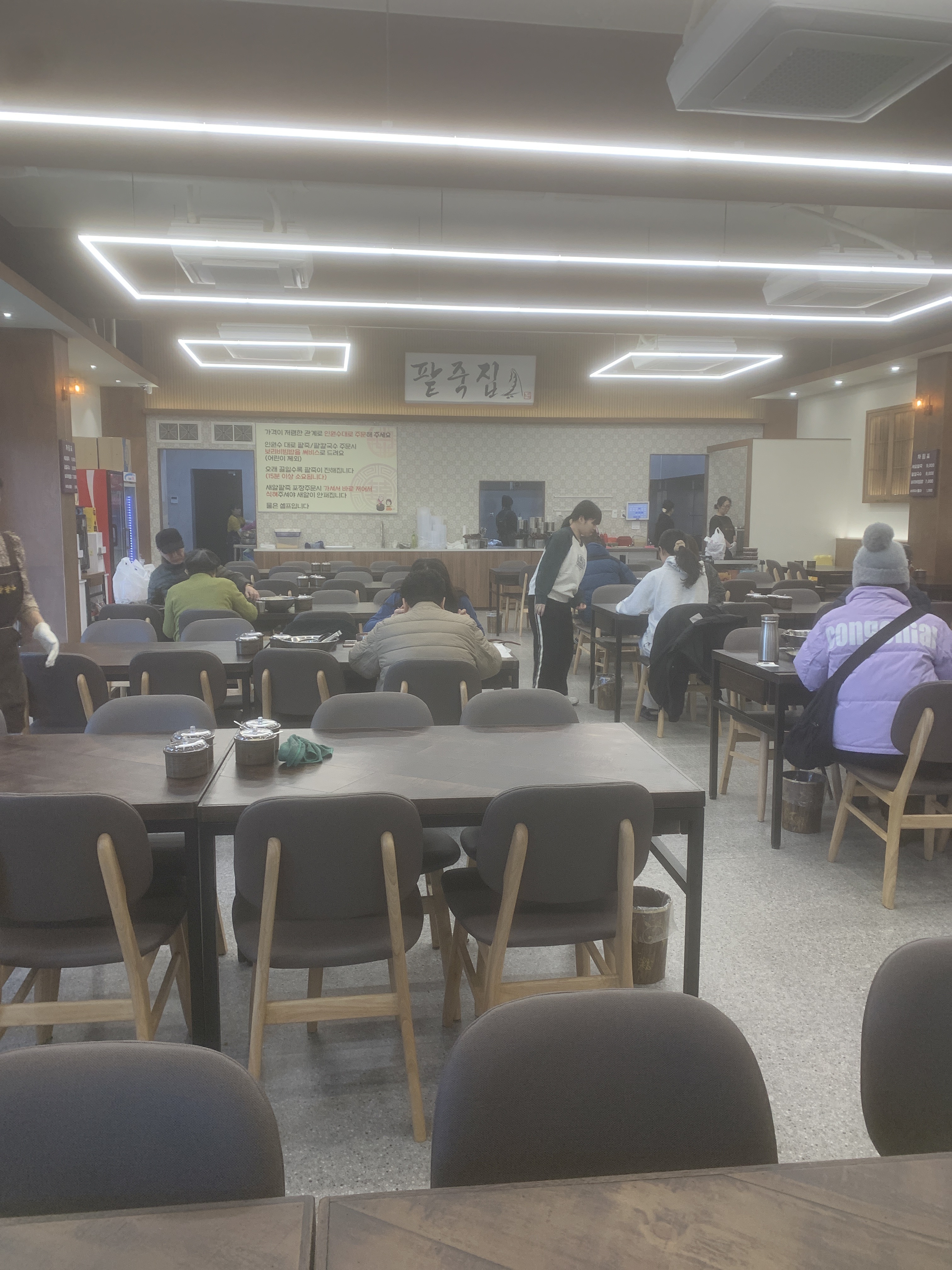 비가 와서 그런지 대기줄은 없었어요. 주차는 가게앞에는 주차할곳이 없어 건너편 비포장주차장에 해야 하더라고요. 식당 안에 들어서니 손님들이 꽉 차 있어서 놀랐어요. 비가 와서 별로 없을줄 알았는데 많네요. 창가 쪽에 자리잡고 앉아 팥죽과 칼국수를 주문했어요. 김치겉절이와 무생채가 먼저 나오는데 맛있어요 .완존~~ 보리밥비빔밥이 먼저 나오는데 아웅..왜 사람들이 줄서서 먹는지 알겠더라고요. 새알팥죽과 칼국수도 말할것도 없어요. 양도 어마어마하고 맛도 아주 좋아요 남은 죽은 포장용기 500원 주고 싸 왔어요~