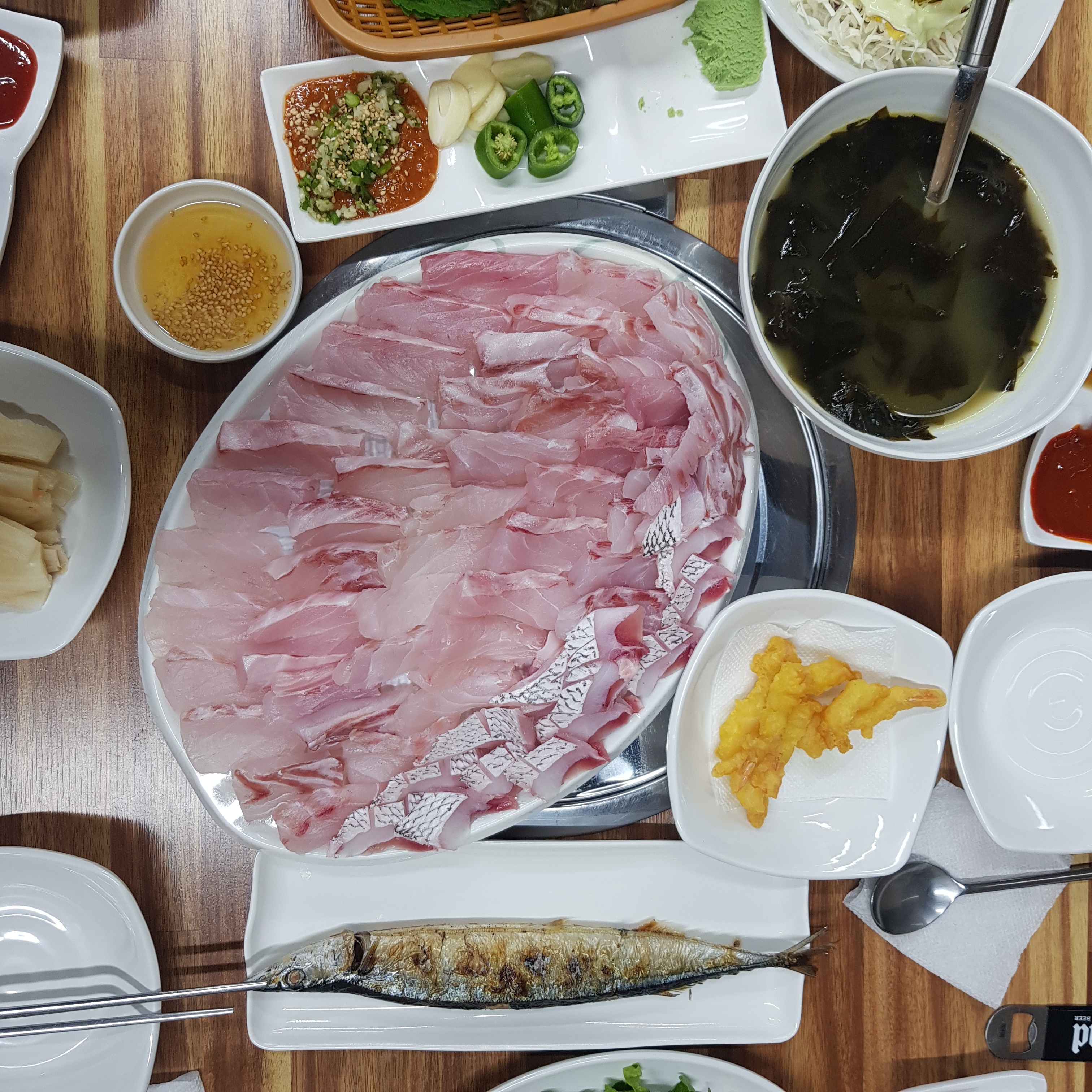 굥이능배고파달달한 활어회🫶😊🧡 둘이서 새로 6병 순삭 (한병당 4,500원) 이정도면 새로 회사에서 상 안주나!?😆 소스와 찰떡 생선튀김, 아삭한 샐러드와 백김치, 맛좋은 양념 가자미구이, 야채회무침은 서비스☆ 최애 광어회 & 부드러운 연어회(30,000원) 바삭한 새우튀김(10,000원)과 얼큰한 매운탕(7,000원)까징~ ❤️🧡💛💚🩵💙🩵 배부르고 맛있고! 기분좋게 자알~ 먹었당ㅎㅎ