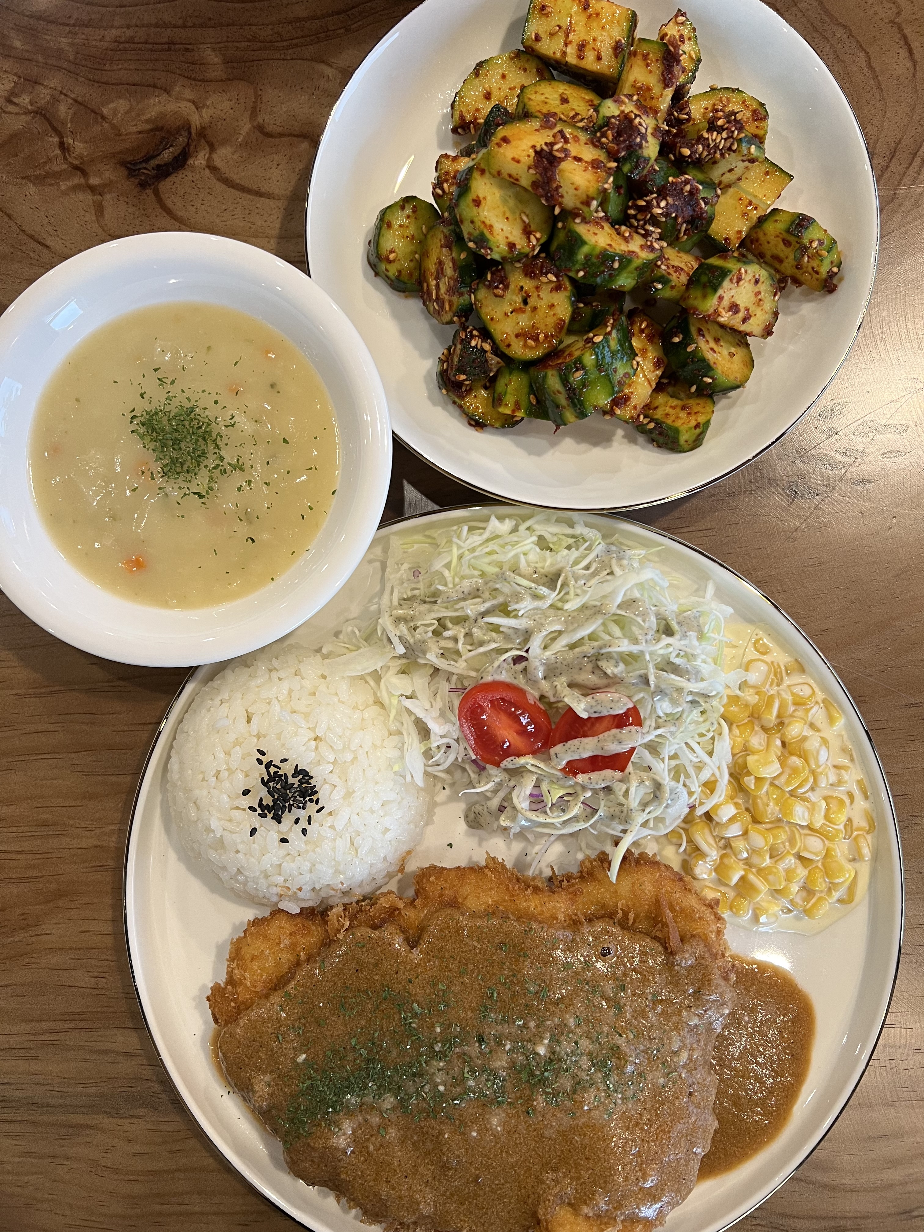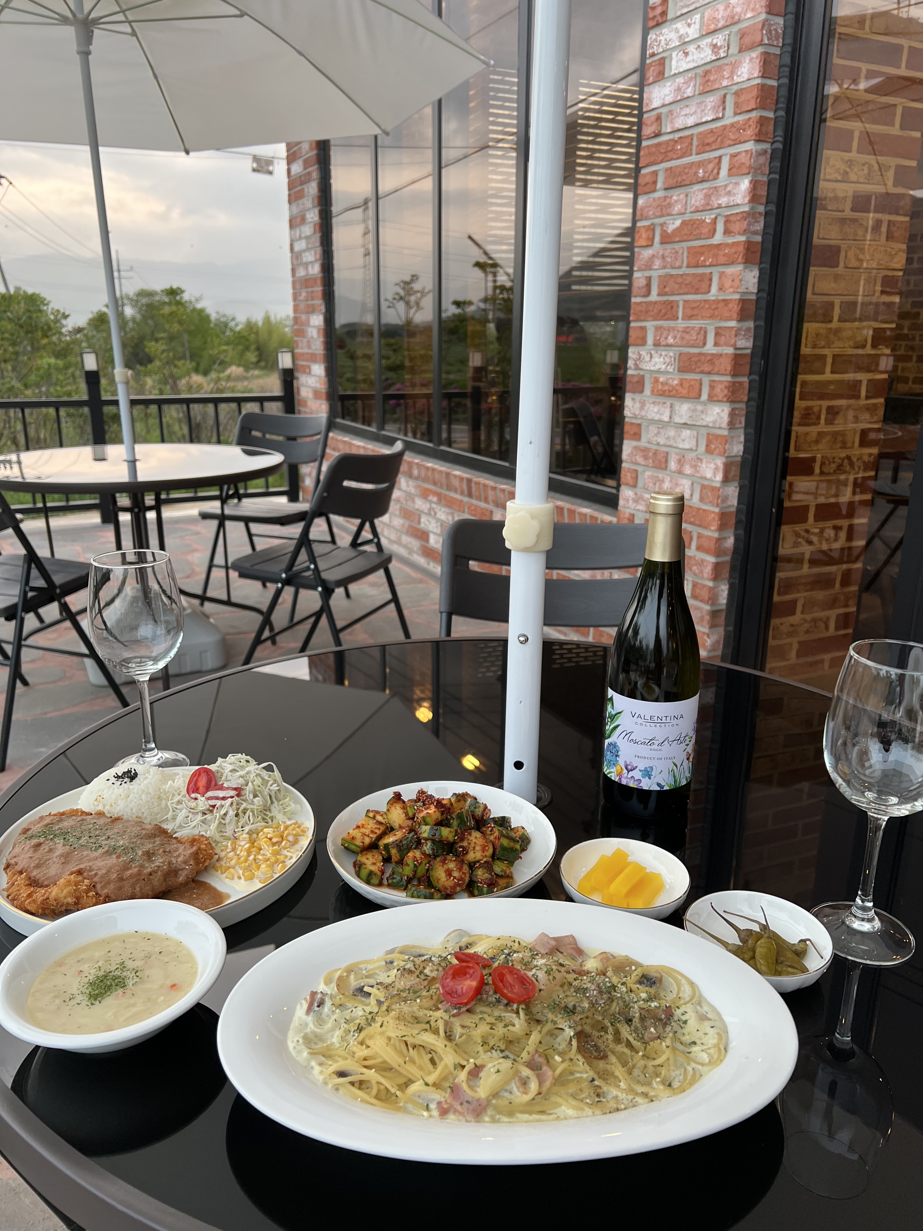 하늘호수속으로운조루 고택 왔다가 집에 가는 길, 운치있는 상호명에 이끌려 들어왔습니당! 이른 저녁을 먹으러 와서 들어올 때는 몰랐는데 저녁 먹고 나가면서 보니 테라스로 쏟아지는 붉은 노을뷰 맛집이었네요. 건물 형태가 2층 양옥으로 주택을 개조한 느낌이었고 레스토카페로 운영중! 주메뉴는 돈까스와 파스타여서 국내산 돼지 등심을 이용해 만든 수제돈가스와 수제돈~위에 눈꽃처럼 하얀 치즈가 뿌려진 눈꽃치즈돈가스로 주문! 경양식 돈가스 스타일로 옥수수스프로 시작해 커피까지 풀코스로 나왔구요. 크고 넓적한 돈가스에 스쿱으로 푼듯한 아이스크림모양 밥과 상큼한 샐러드에 마카로니까지 접시를 꽉 채우셨어요. 텁텁함없이 과일의 단맛이 도는 소스가 아주 상큼했고 킥은 시큼함없이 칼칼하게 버무린 오이무침으로 느끼함을 싹~잡아줬어요~