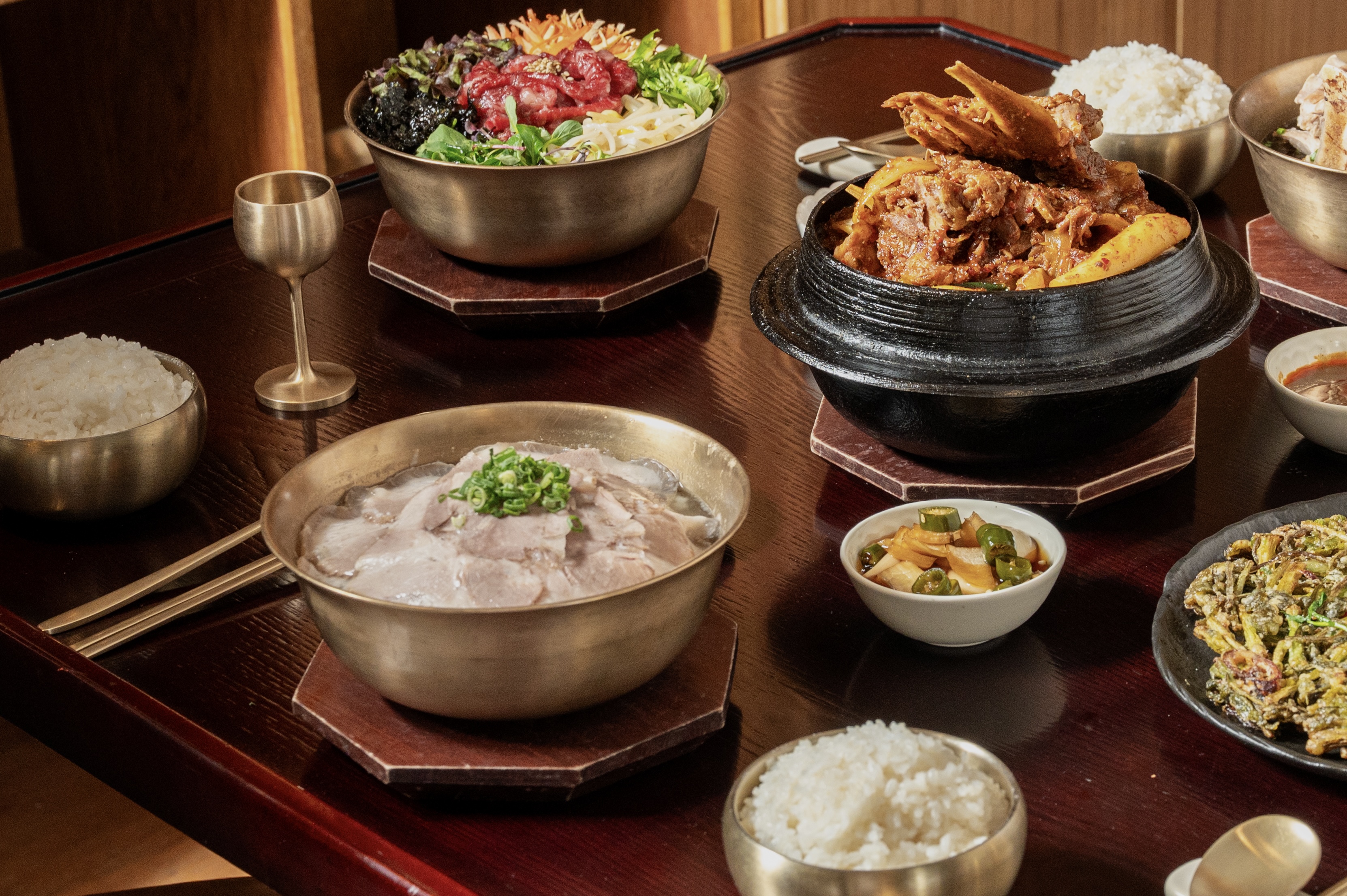 럭키토끼다이닝🍲🥗 깔끔하면서도 담백한 돼지공탕 ~~ 인기많은 봄동에 신선한 육회를 듬뿍 넣어 비벼먹는 봄동비빔밥~~ 새로운 조리법으로 입안 가득 맛있음이 뿡뿡 입니다~😍🤩👍 🍲🥗 전통한식집같은 분위기예 벽면에 전통소주를 전시해 두어 눈낄을 확~~끄네요 특히 식탁이 옛날 시골집 상처럼 되어 있어 한국인의 밥상~~😍🤩😅 🍲🥗 밑반찬은 테이블 오더 밑에 파김치와 깍두기가 준비되어 있고 특히 파김치가 맛있네요~~👏👏 돼지공탕은 맑은 국물에 밥위로 괴가 가지런히 놓여있고 함께나온 갈치속젓을 곁들이면 담백하면서도 쫄깃 합니다~~ 국물은 섬섬하면서도 진국이네요 신선한 육회가 가득 올라간 봄동비빔밥은 육회의 신선함과 봄동의 상큼함이 너무 잘어울려 맛나요~~🤩😍 🤩😍 네이버리뷰작성시 나오는 만두도 고기듬뿍 맛있어요 ~~👏👏👏