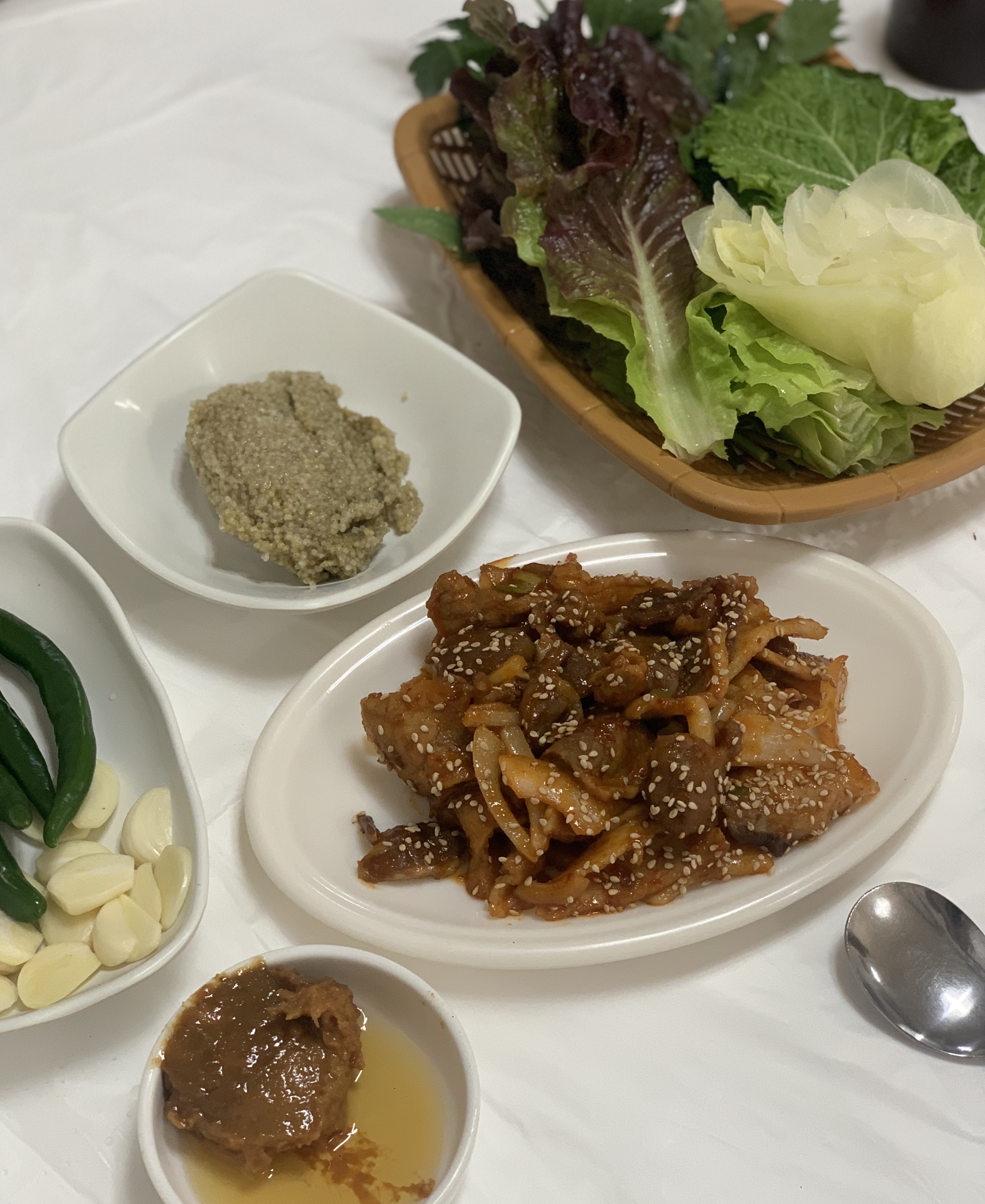 하늘호수속으로대흥사 다녀오는 길에 우연히 들어가게된 보리쌈밥! 이 주변이 거의다 비슷한 메뉴여서 그냥 발길 닿는 식당으로 들어갔는데 탁월한 선택이었네요. 14종의 밑반찬과 4종의 쌈, 그리고 돼지불고기가 철판에 담겨 나옵니다. 원래는 꽁보리밥인데 오늘 손님이 많아서 보리밥이 부족해 쌀밥과 보리밥이 섞인 대접을 주셨는데 전 이게 더 좋았어요. 반찬들이 진~짜로 어머니 손맛! 김치도 고추갈아서 담그셨고 된장은 집된장으로 멸치육수 우려낸 된장국도 감칠맛 폭발~돼지고기는 느낌상 특수부위 그 어딘가인듯한데 넘너무 쫀득쫀득하고 잡내 1도 없이 맛나부러요. 그라고 서비스로 주신 조밥은 찰지고 맛있어서 묵은지에 싸서도 묵고 토하젓에 올려도 묵고😁 테이블 간격이 좁아서 불편했지만 음식은 완전 맛있다요!