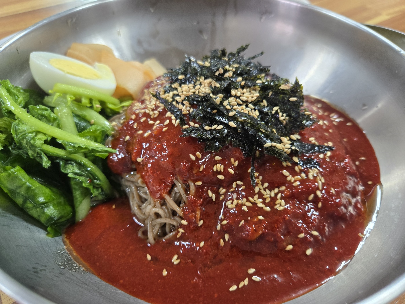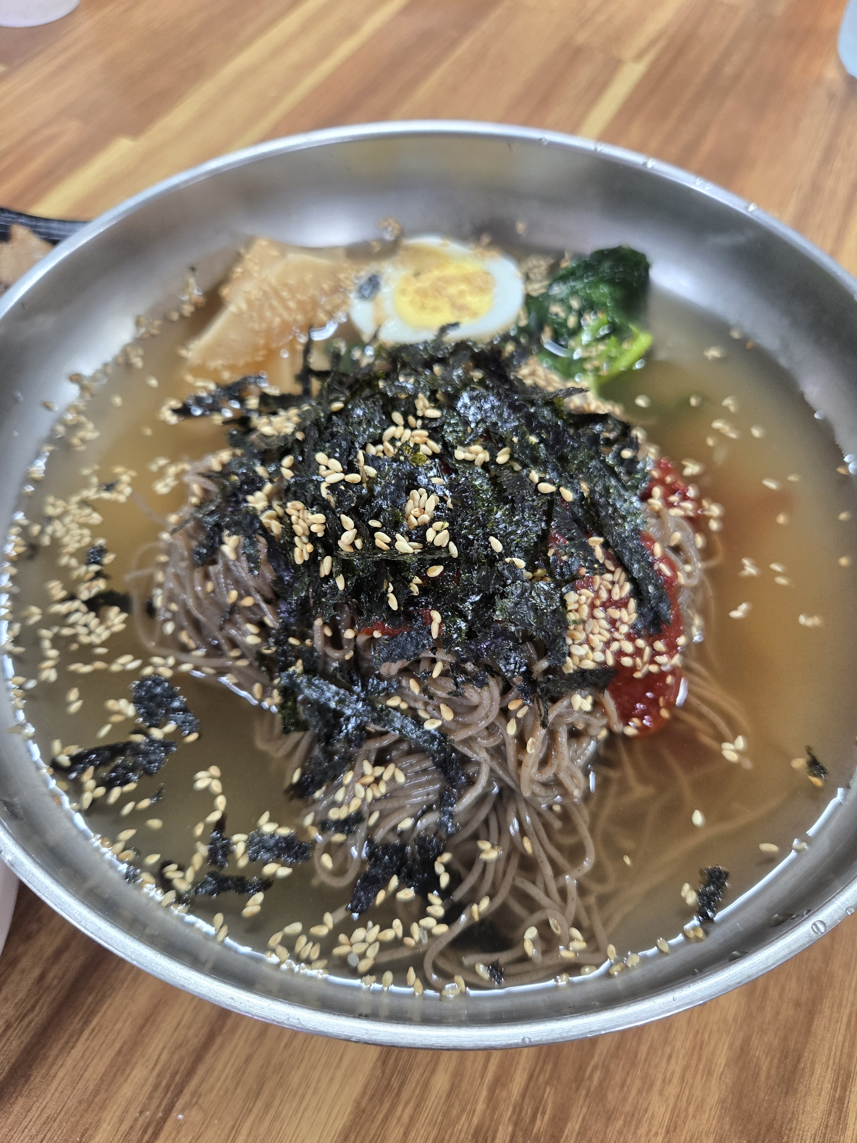 가장 큰 특징은 막국수를 주문하면 고기가 같이 나와서 가성비가 좋아요 저희는 물막국수, 비빔막국수, 코다리회막국수 세 가지 종류를 모두 맛봤는데요 물막국수는 동치미 육수처럼 시원하고 깔끔한 맛이 일품였구요 비빔막국수는 양념이 감칠맛 돌면서도 너무 달거나 맵지 않아 계속 당기는 맛이었어요. 코다리회막국수는 꼬들꼬들한 코다리회가 쫄깃한 면과 어우러져 고급스러운 식감을 선사해서 별미였답니다 메밀만두는 담백해서 막국수랑 조화가 좋더라구요 메밀막국수 전문점 답게 메밀차도 있는데 따뜻 고소하니 좋았어요 매장도 겉보기보다 내부가 훨씬 커서 단체손님도 가능해요