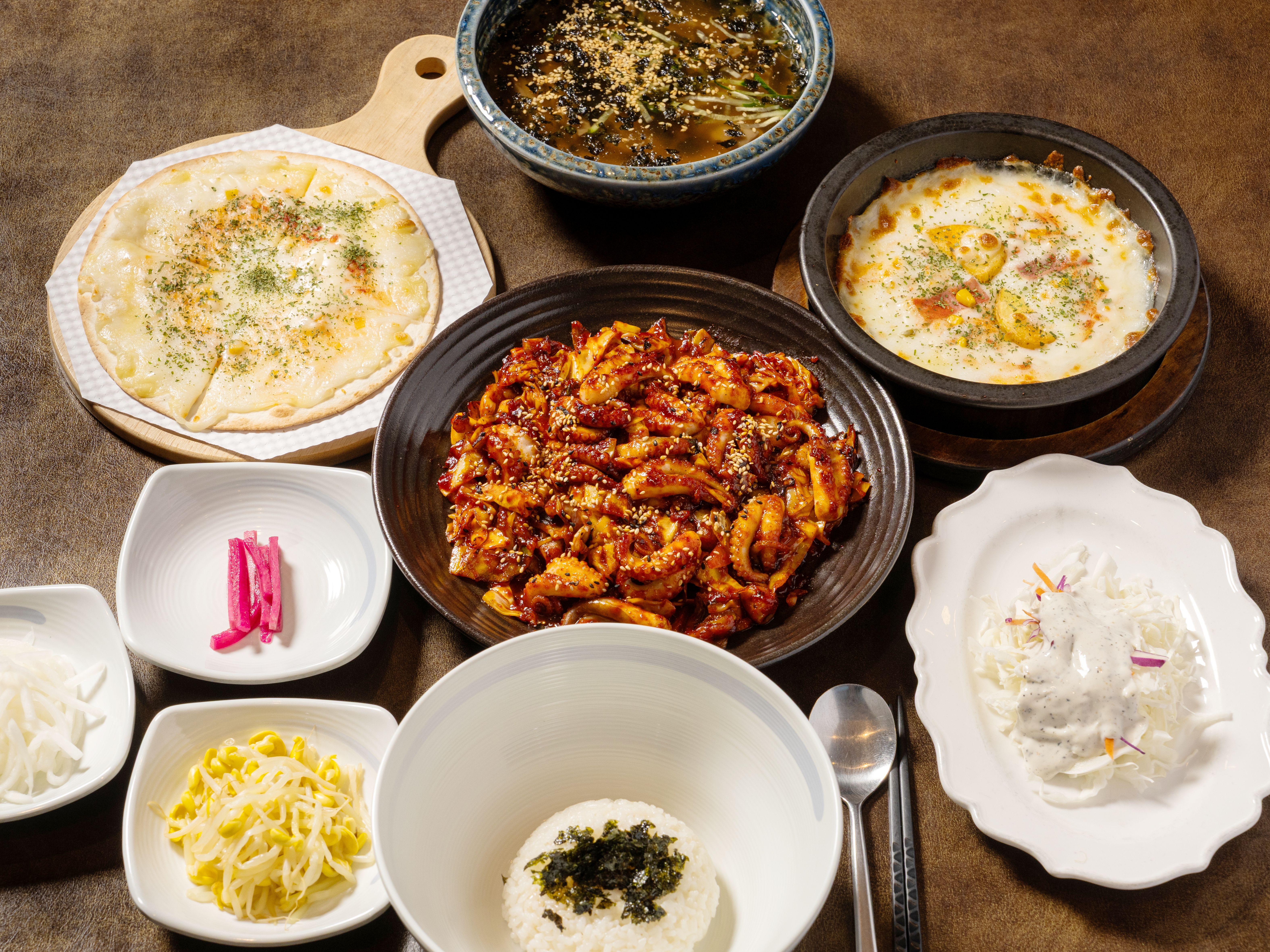 쭈꾸미세트에 떠먹는 피자 일반피자 선택가능 떠먹는자 치즈가 많아 맛있어요 쭈꾸미 맛도 선택가능하며 불향이 나며 전체적으로 간이나 맛이 잘 맞아요