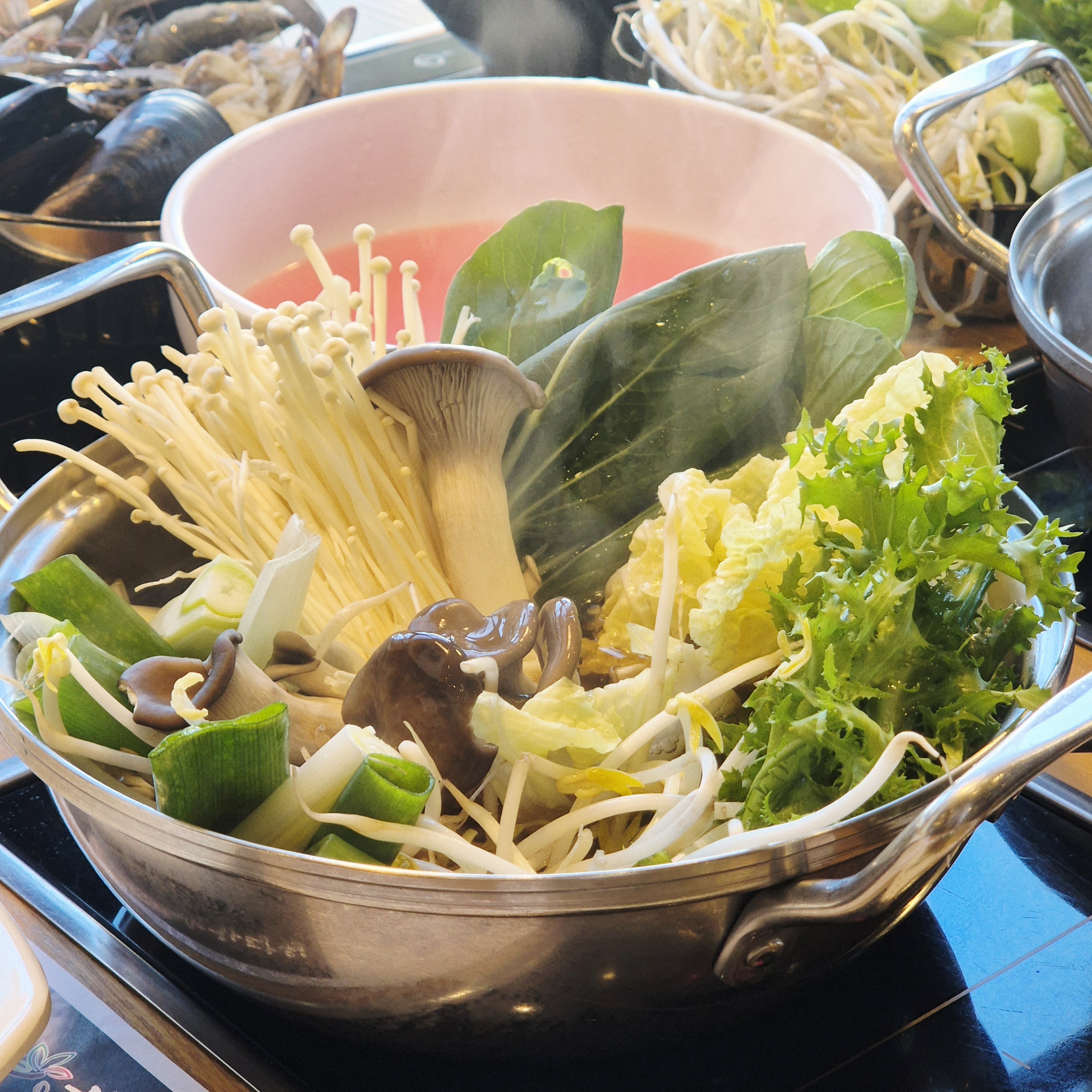 빠담푸샤브샤브를 각자 먹을수 있어서 재료 신경 안쓰고 넣을수 있어 좋습니다. 샐러드바는 작지만 그래도 구성 나쁘지않아요.