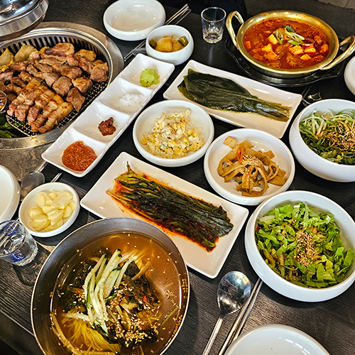 자유pick고기 볏짚향나고 너무 육즙 팡~풍미좋고 맛있어요. 누룽지소금,와사비,갈치속젓 대파 김치 명이나물 등 여러가지로 즐길 수 있어 다채롭게 취향대로 먹을 수 있었습니다 추가로 가브리살시켰는데 진짜 부드럽고 굿굿 셀프바도 있어서 야채도리필가능했어요 김치말이국수도 옥수수면인지 노란데 쫄깃하고 맛있습니다.