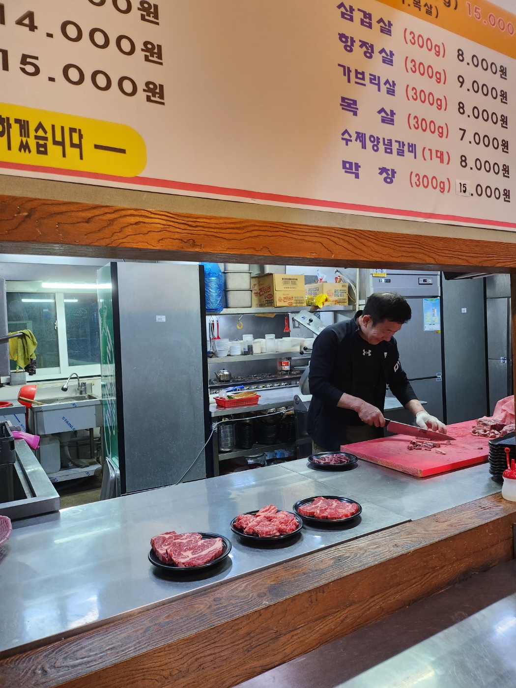 청초의왕 방향 한세대 근처 군포 당정동에 있는 가성비 좋은 고기 무한리필집입니다. 광개토프라자라는 5층 정도 되는 건물의 2층에 있습니다. 전화 031-398-8312, 010-****-**** 엘리베이터를 내려 오른쪽 방향에 있습니다. 영업시간이 아침 12시부터 저녁 11시까지로 되어 있는데 아침 12시가 몇시인지 모르겠습니다. 홀이 무척 넓습니다. 대형룸도 있습니다. 우리가 도착한 시간은 오전 11시를 조금 넘겼는데 한산합니다. 메뉴 단품특선 : 소갈비살, 삼겹살, 육회 고기 및 채소 냉장고 시간이 일러 아직 고기가 진열되지 않았음 윗단 : 꽃등심, 부채, 토시 갈비 아랫단 : 삼겹살, 항정살, 가부리살, 돼지쫀득살 윗단 : 소세지, 새우, 돼지막창 아랫단 : 흑돼지 목살, 돼지고기수제양념갈비, LA갈비, 돼지껍데기 반찬냉장고 우리는 점심을 먹으러 간 것이기 때문에 점심특선 3인분 주문 인당 만원, 갈비살 200g 반찬은 셀프입니다. 고기, 숯불, 공기밥, 된장찌개는 직원분이 가져오십니다. 의외로 소고기 된장찌개가 얼큰하면서 맛이 아주 좋습니다. 갈비살을 굽습니다. 육즙이 풍부한데 느끼하지 않고 담백하며 부드럽습니다. 무한리필하면 질 떨어지는 고기로 인식 되어서 안 가는데 어느분 포스팅보고 갔는데 생각보다 훨씬 좋아요 다음번에는 점심특선이 아닌, 저녁에 무한리필로 먹으러 가려 합니다. ---------------------------------------------------------------------------------------------------- 무한리필을 먹었습니다. 고기를 골라옵니다. [ 등심 } [ 부채살 ] [ 토시살 ] [ 갈비살 ] [ 돼지 목살 ] [ 돼지 쫀득살 ] [ 돼지 막창 ] [ 돼지 가브리살 ] [ 돼지 항정살 ] [ 돼지 삼겹살 ] [ 돼지 양념갈비 ] [ 소시지와 새우 ] 우삼겹, 대패삼겹살, 양념 LA갈비, 돼지껍데기는 찍지 못했네요. [ 고기 굽기 ] 고기의 질과 신선도는 아주 좋습니다. 맛이 어느 것이 제일 좋았느냐를 물어보니 각각 다르네요. 3명이 각각 "갈비살, 쫀득살, 막창"을 꼽았습니다. 양념고기(LA갈비,돼지갈비,돼지껍데기)의 양념은 좀 달달했습니다. --------------------------------------------------------------------------------------------------- 주차장은 지하에 있는데 좁습니다. 옆 건물 카센터를 이용해도 됩니다.