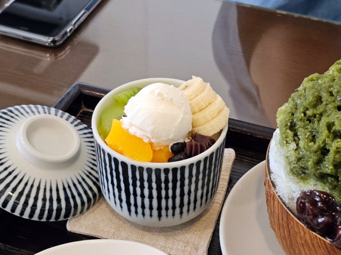 평소에 붐벼서 잘 오지 않는 곳인데, 오늘은 자꾸 생각이 나서 방문한 흰다정입니다 😊 운 좋게도 자리가 딱 나더라구요ㅎ 영랑호에서부터 걸어온 보람이 있었습니다🚶‍♂️ 많이 걸어서 살짝 땀이 난 뒤라 <호지차블랑(ICE)>, <바나나안미쯔> 주문했어요 🍵 속초에 훌륭한 커피숍은 많지만, 커피가 아닌 차 음료를 제대로 만드는 곳은 몇 군데 안 됩니다. 그중에서도 흰다정은 재료를 아끼지 않고 진하고 맛있는 차 음료를 내주는 곳 중 하나라고 생각해요 👍 디저트는 다소 달달한 편인데 차의 씁쓸하고 진한 맛과 밸런스가 좋아 함께 맛보면 적당해요🍨 다만 워낙 인기가 많은 공간이라 내부가 다소 소란스러워 찻집 특유의 정갈하고 정적인 분위기는 없는 편입니다. 방문하실 분들은 이 점 참고하시길 😊✨