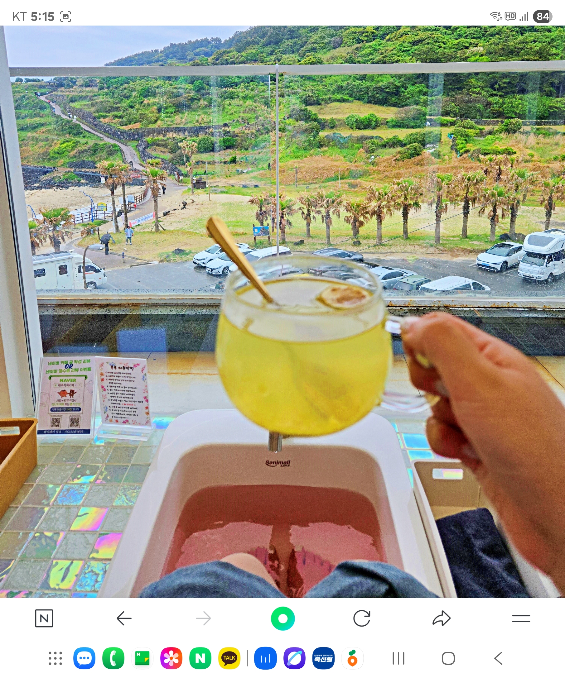 sy****친구와 둘이 갑자기 오게된 제주도 여행 함덕해수욕장을 보고 주변을 돌며 힐링의 시간을 갖고 차마시며 피로풀며 족욕을 할수있는곳을 찾아 들어왔는데~와우 ~~발 담그고 바다보며 차마시며 느끼는 여유로움~~~너무 좋네요. 커피도 맛있네요~