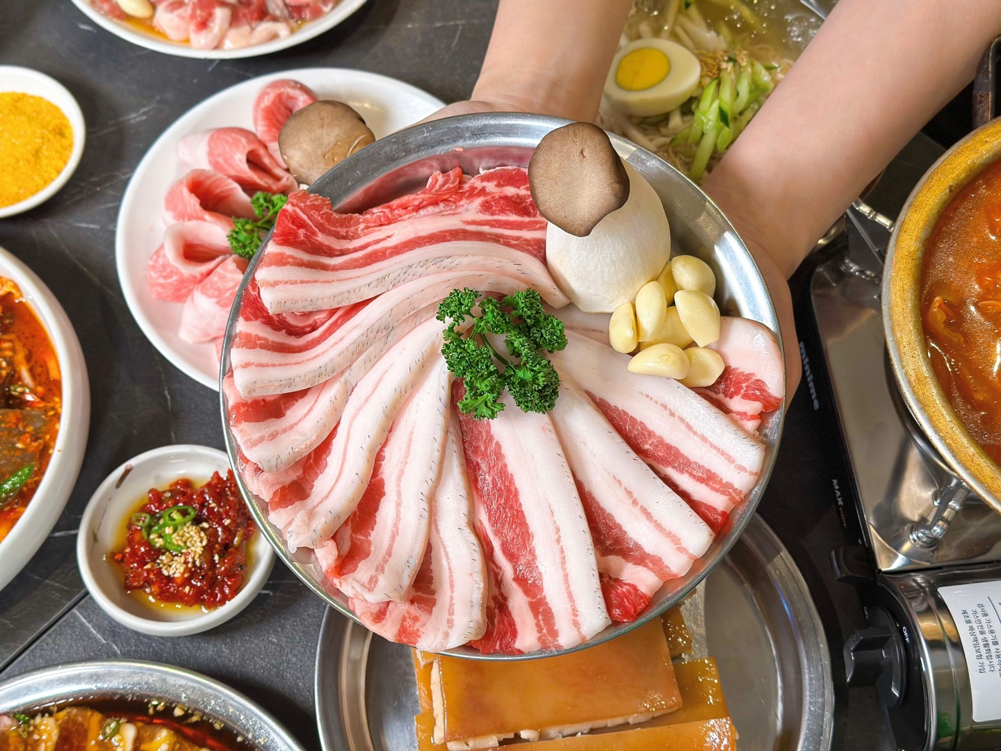 Rively성인4명 아이3명 방문했습니다. 모듬3-4인 95,000원 / 한돈 생갈비4인 52,000원 / 모듬 2-3인 58,000원 / 껍데기 2인 16,000원 / 된장술밥 5,000원 물냉면 5,000원 주문했습니다. 고기는 싱싱하고 맛있습니다. 화력좋고 빠르게 구워집니다. 누린내가 없고 고기가 쫀득했습니다. 양념도 밥이랑 먹기에 적당하고 맛있습니다. 곤드레밥 고슬하니 곤드레가 많아서 맛있습니다. 양념장과 같이 먹어도 좋습니다. 물냉면은 고기의 느끼함을 싹 잡아주고 시원하니 맛있었습니다. 특히, 껍데기 정말 맛있습니다 적당한 두툼함에 껍데기가 잘라져있어서 먹기도 편하고 마지막에 먹기 딱 좋습니다! * 주차장 있습니다. * 아기의자 있습니다. * 사람들이 많아 시끄러울 수 있습니다.