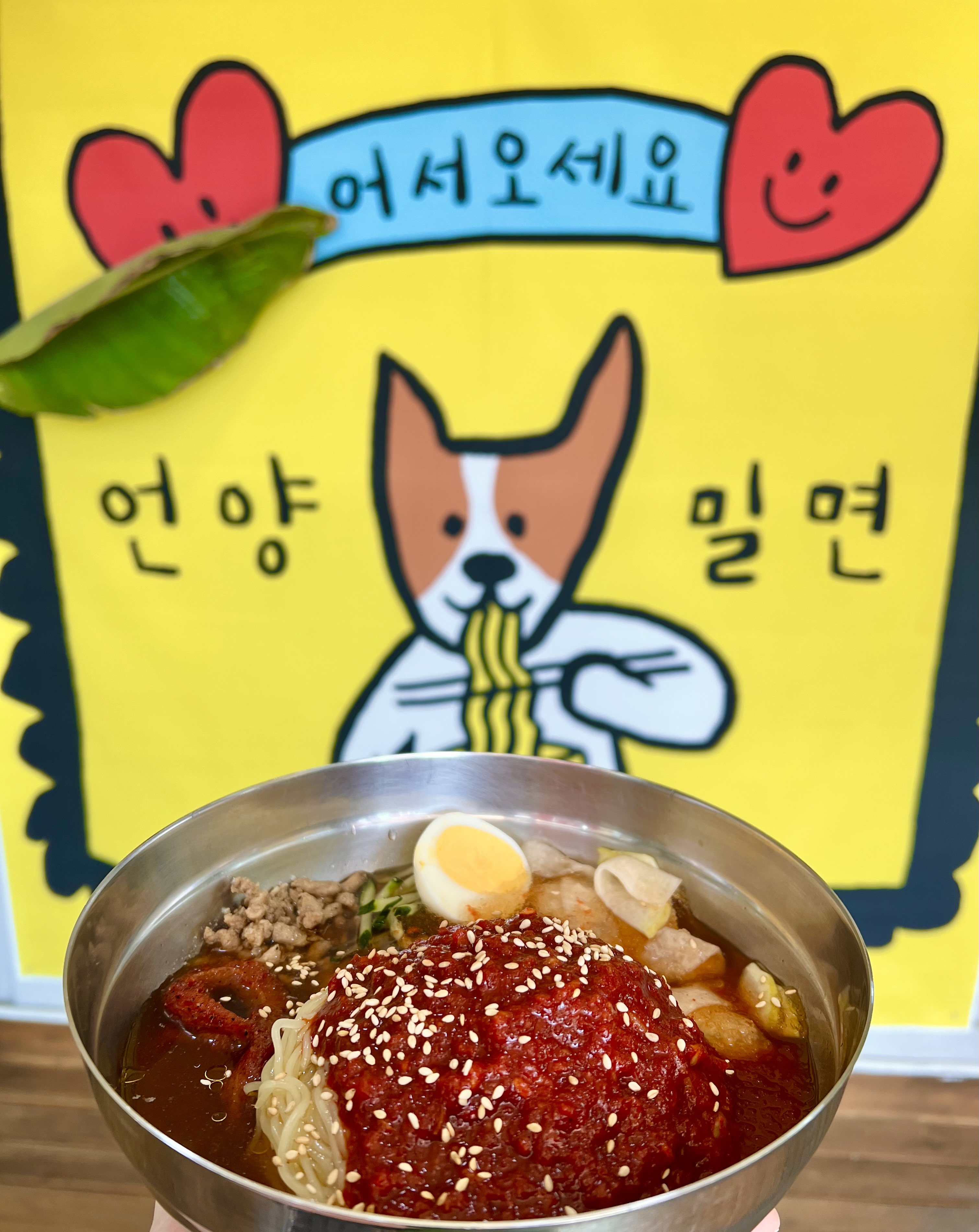 l은혜갚은꽁치l언양 밀면 맛집❤️ 언양 밀면 두 번째 방문했는데, 약 15분 정도 대기하고 들어갔어요! 기다리는 동안 햇빛 가릴 수 있는 초록 우산도 마련되어 있어서 너무 좋았어요 :] 총 3가지의 밀면 종류가 있는데, 언양 밀면이 [물밀면+비빔밀면]이라서 너무 맛있었고 기본 양 자체가 곱배기 급이라.. 엄청 많아요!!! 만두랑 같이 먹으면 꿀맛입니다👍🏻 캐릭터가 너무 귀엽고, 스티커도 너무 귀여워요!! ᕕ( ᐛ )ᕗ💖 • 주차장이 작은 편이라, 근처 주차장에 주차하고 걸어서 방문하는 게 좋을 것 같아요!