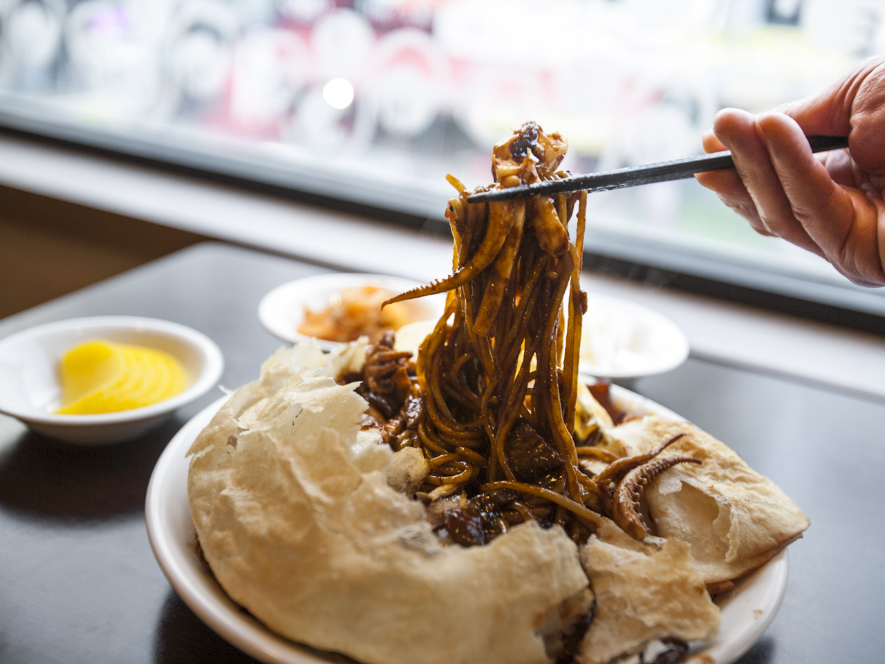 SKYS13🔴26/02/09(월) 6번째 방문. ✅뿌셔뿌셔 해물짜장면(14,000원)🥖🔨🐙🦐🥩🧅🍜 OP. 매운맛(+0원)🌶️ 그동안 여러번 방문했는데 방송에 나왔던 뿌셔뿌셔 해물짜장면(망치짜장면)은 이번에 처음 주문해봤어요🥖🔨🍜 해물짜장면을 바삭한 식감의 둥근 빵과자로 덮은 음식으로, 해물+돼지고기 베이스의 짜장면에 빵과자까지 있어서 체감상 양도 넉넉하고 맛있었어요🙂 그리고 해당 메뉴의 경우 순한맛/매운맛 2가지 중에서 선택할 수 있는데, 개인적으로는 담백한 빵과자가 매콤한 짜장면과 잘 어울리는 것 같아서 매운맛을 추천드리고 싶어요! 그리고 외국인 여직원분도 친절하셨어요~!