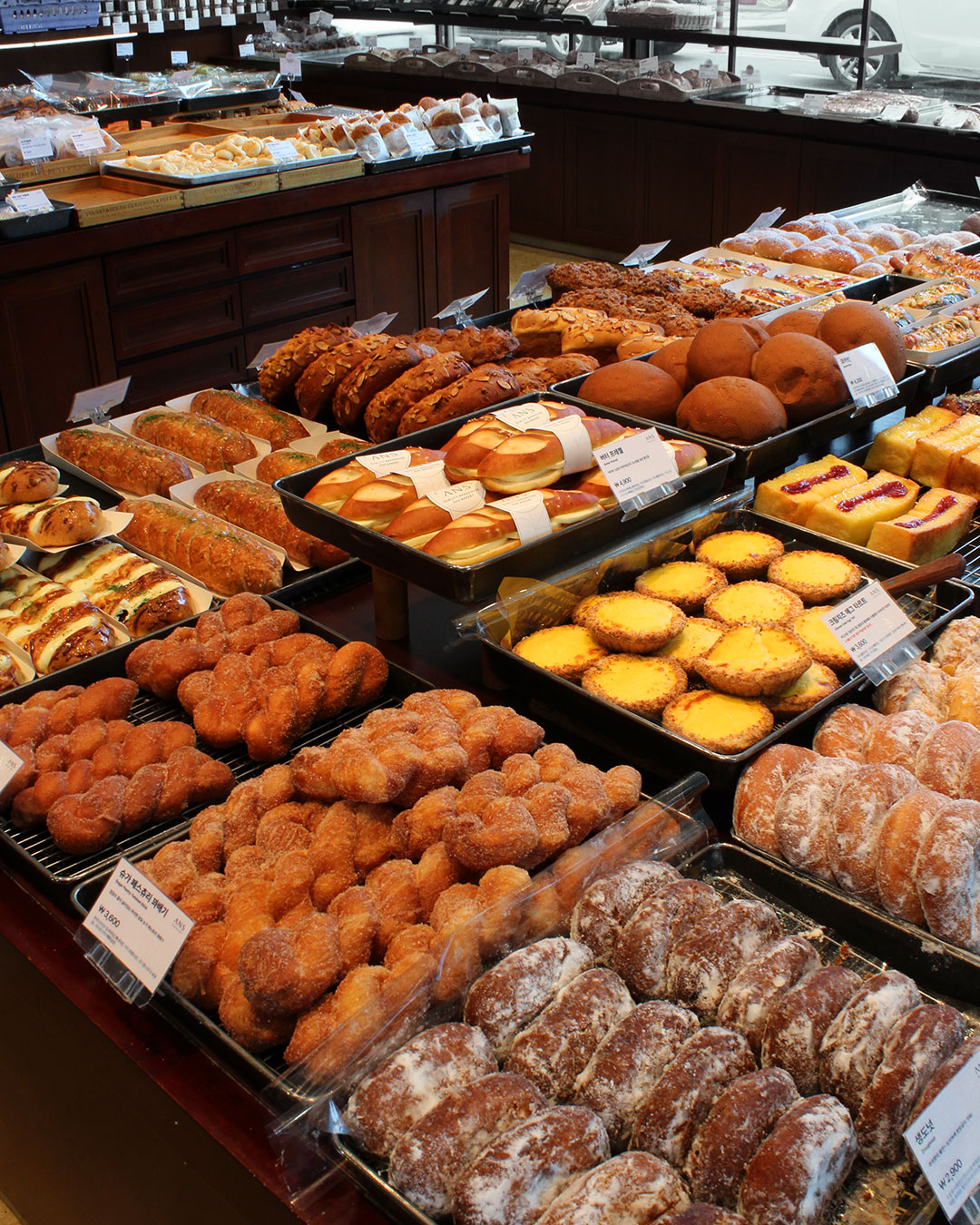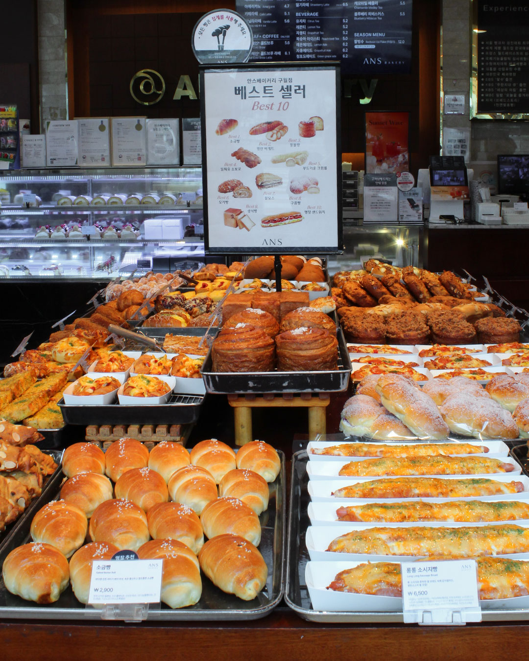 얄리얄리얄라셩인천을 대표하는 빵집이자 국가가 인정한 대한민국 제과 분야 명장 제 7호 안창현 명장의 빵집. 안스베이커리 여러군데 있지만, 구월동이 본점이예요. 저는 그 본점 코앞에 살고 있어요. 너무 가까이 있다보니 안세권의 소중함을 잘 몰라서 종종 가는데도 리뷰를 쓸 생각을 못하다가 올해 이후에 이사를 계획하고 있다보니 황급히 기록으로 남겨봅니다. 안스는 기본적으로 달콤하고 시즈닝이 많이 되어있는 빵들이 많아요. 그래서 맛있습니다. 뉴요커 소시지 5,900원 바질크림치즈 5,700원 소시지 야채빵 4,700원 이런 빵 외에도 까눌레 3,000 크로와상 3,900 같은 심플하고 담백한 빵도 있구요 까눌레는 먹어보긴 했는데 다른 곳 까눌레를 먹어본적이 없어서 맛이 있는지 없는지 평가를 못하겠어요. ㅎㅎ 팥모스 6,000(half) 구름빵, 모카빵 같은 우리 엄마 취향의 빵들도 있고 베이글소시지스틱 5,400 안스에서 나오는 소시지 들어간 빵들은 대체적으로 성공적인거 같아요. 소시지를 좋은 걸 쓰시는지 진짜 뽀독뽀독 통통하거든요 왠지 선물하기 좋은 화이트크림롤& 모카크림롤 16,500 버터바 이름은 많이 들어봤는데, 처음 봤어요! 무슨 맛일까요 안스의 베스트셀러 소금빵 명란바게트 생식빵 명장샌드위치 몽블랑 10개 중에 5개는 먹어봤네요 ! 생일 때는 안스에서 케익을 사는 편이에요 1호 정도면 저희집은 충분히 먹고도 남고 크림이 정말 맛있거든요 생크림1호 39,000 생크림2호 44,000 딸기에반하다 1호 42,000 요즘 케익값이 워~낙 비싸다 보니 오히려 안스케익이 저렴해보이네요. 처음엔 비싸다고 생각했는데 ㅋㅋ 쿠키 종류 호두 미니 파이 6,900 진짜 맛있어요 여러군데 소금빵을 먹어봤지만 제 입에는 안스베이커리 소금빵이 best 저는 부드러운 텍스쳐를 좋아하는데 보드랍고 바닥은 살짝 크리스피 해서 진짜 맛있어요 고르고 있는데 직원분이 새로 나온 빵으로 드릴까요 해서 너무 기분 좋았습니다. 친절해.. 명란바게트랑 명란파바게트가 있는데 저는 압도적으로 명란파바게트가 맛있습니다. 이번 겨울 시즌 유튜브에서 진짜 많이 봤던 파네토네 만들기 진짜 복잡하고 오래걸리던데 파네토네도 팔고 있어요 구경한거에 비해 소박한 나의 구매 목록 소시지야채빵 데리버거 소금빵 이탈리안고로케 커피와 음료도 팔고 있으니 사서 같이 매장 내에서 드셔도 좋을꺼 같아요. 주차 뒤에 주차장이 있는데 크지 않은 걸로 알고 있어요 다만, 뒤쪽 도로에 자리들이 있다면 주차하시면 됩니다. (동네주민으로써 주차장에...
