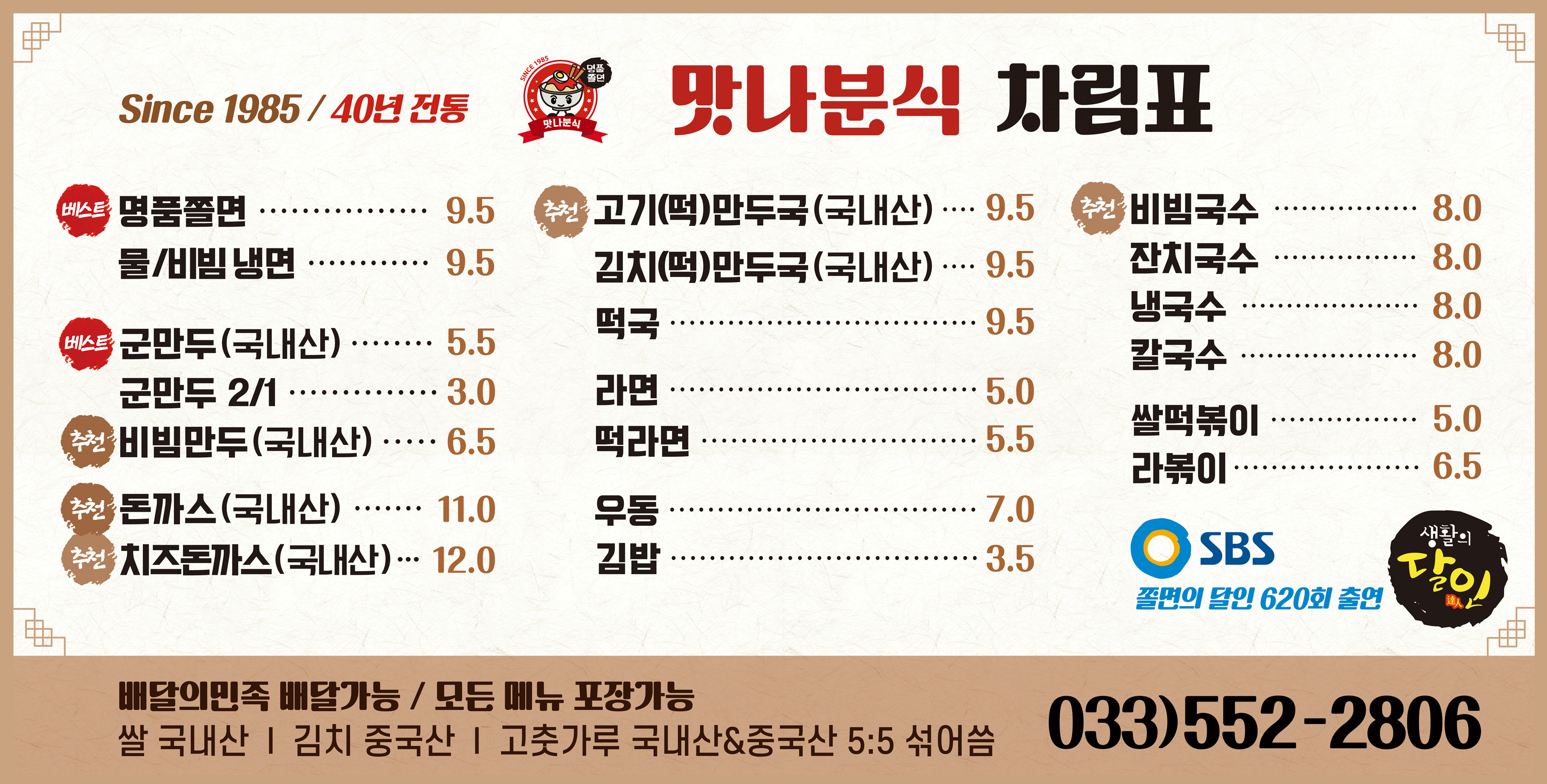 Gongbbudamha태백 현지분들이 “쫄면은 꼭 먹어야 한다!”고 해서 찾아간 맛나분식. 1985년부터 40년 넘게 운영 중인 태백 대표 분식집이에요. 가게 내부는 오래됐지만 깔끔하고, 점심시간엔 지역 주민들뿐만 아니라 여행객들로 북적북적하더라고요 맛나분식 매장정보 맛나분식 (Since 1985) 주소 : 강원 태백시 번영로 340 ☎️전화 : 033-552-2806 ⏰영업시간 : 10:00 ~ 20:00 휴무일 : 수요일 포장, 배달 가능 주차 매장 앞 맛나분식 메뉴판 대표메뉴 가격정보 명품쫄면 / 물·비빔냉면 9,500원 군만두 5,500원 ( 1/2 하프 3,000원) 돈까스 11,000원 / 치즈돈까스 12,000원 잔치국수·비빔국수·냉국수 8,000원 쌀떡볶이 5,000원 / 라볶이 6,500원 김밥 3,500원 SBS ‘생활의 달인’ 쫄면의 달인 620회 출연 가게! 주문메뉴 (성인2, 아이1) 쫄면 9,500원 군만두 5,500원 잔치국수 8,000원 메뉴 & 추천 조합 벽에 걸린 메뉴판을 보면 “명품쫄면”이 베스트로 표시돼 있는데, 진짜 이유가 있어요… 쫄면이 너무 맛있어요‼️ 양념이 새콤달콤하면서도 감칠맛이 폭발 면발이 쫄깃해서 한입 먹자마자 “이래서 현지인이 추천했구나” 싶었어요. 솔직히 두 번, 세 번 먹고 싶을 정도로 강추입니다. 군만두랑 찰떡궁합이예요. 쫄면 양념장을 따로 판매도 하셔서 사왔는데, 고기랑 같이 쌈장대신 먹어도 너무 잘 어울리더라구요 같이 시킨 잔치국수(8,000원)**는 깔끔하고 담백했지만, 쫄면의 임팩트가 워낙 세서 상대적으로 평범했어요. 따뜻한 국물 한입용으로는 괜찮아요! 할인 꿀팁 벽에 보니까 ‘강원 생활 도민증’ 할인 이벤트가 붙어 있더라고요. 모든 메뉴 5% 할인 강원지역 방문자도 QR코드로 간단히 등록하면 혜택 받을 수 있대요. 소소하지만 이런 할인 놓치면 아쉽죠 ㅎㅎ 가격도 부담 없고, 여행 중 간단히 한 끼 해결하기 딱 좋아요. 태백 가신다면 쫄면은 꼭 드셔보세요! 쫄면 맛집 인정!! 이상 태백 맛나분식 내돈내먹 솔직 리뷰였습니다. #여행 #국내여행 #맛집여행 #태백여행 #태백맛집 #맛나분식 #태백분식 #태백쫄면맛집 #생활의달인맛집 #태백여행맛집 #쫄면강추 #강원도민증할인 #태백로컬맛집
