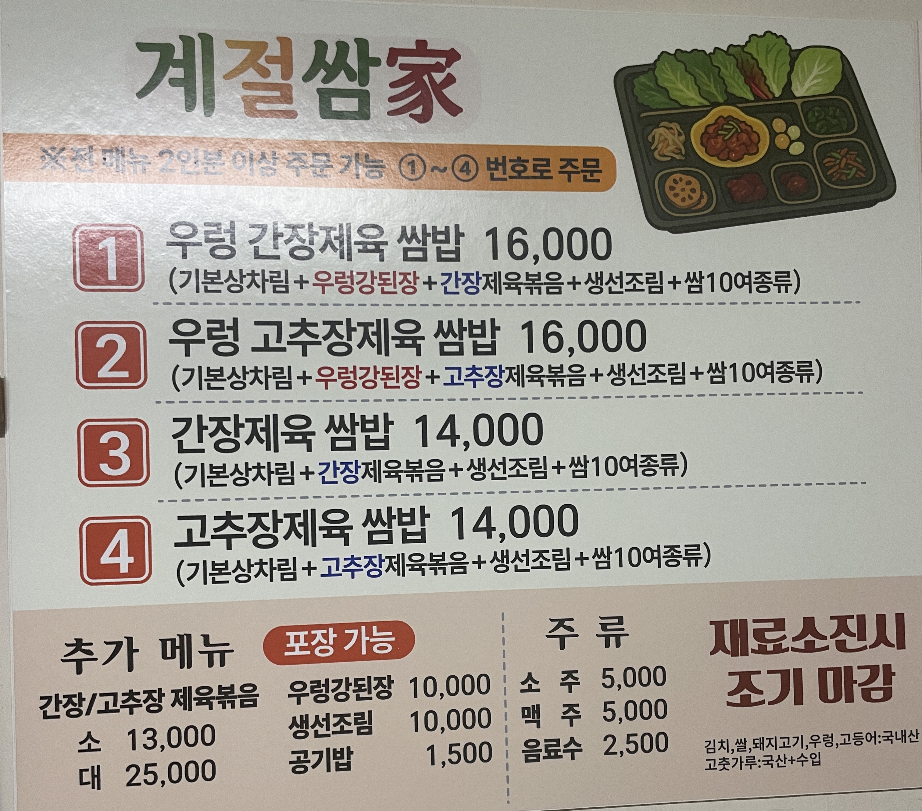 - 우렁간장제육쌈밥 16,000원