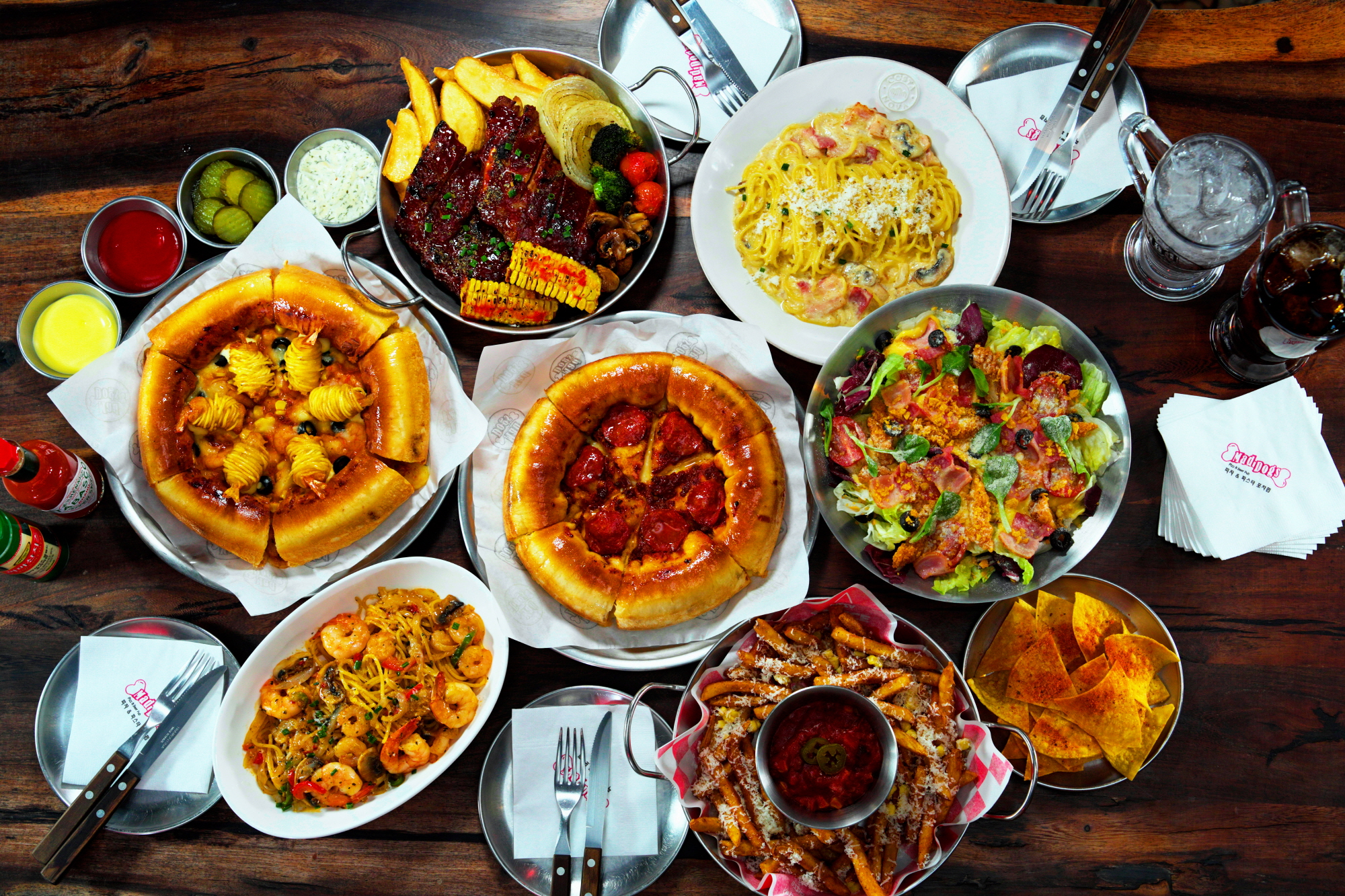 건5653구남로에 2층에 위치한 매드독스, 위치도 좋고 창문밖 구남로 분위기도 좋아요. 내부 인테리어도 피자집 느낌 물씬 납니다. 수요일과 목요일에는 할인하는 메뉴와 주류가 있으니 이 날에 방문하는 것도 좋을 것 같아요. 부산에는 시카고 피자를 먹을 수 있는 곳이 별로 없는데 매드독스는 해운대 구남로와 광안리 해수욕장에서 좋은 퀄리티로 먹을 수 있어서 좋습니다. 셀프바에는 나초, 올리브, 피클, 소스 등이 준비되어 있어요.