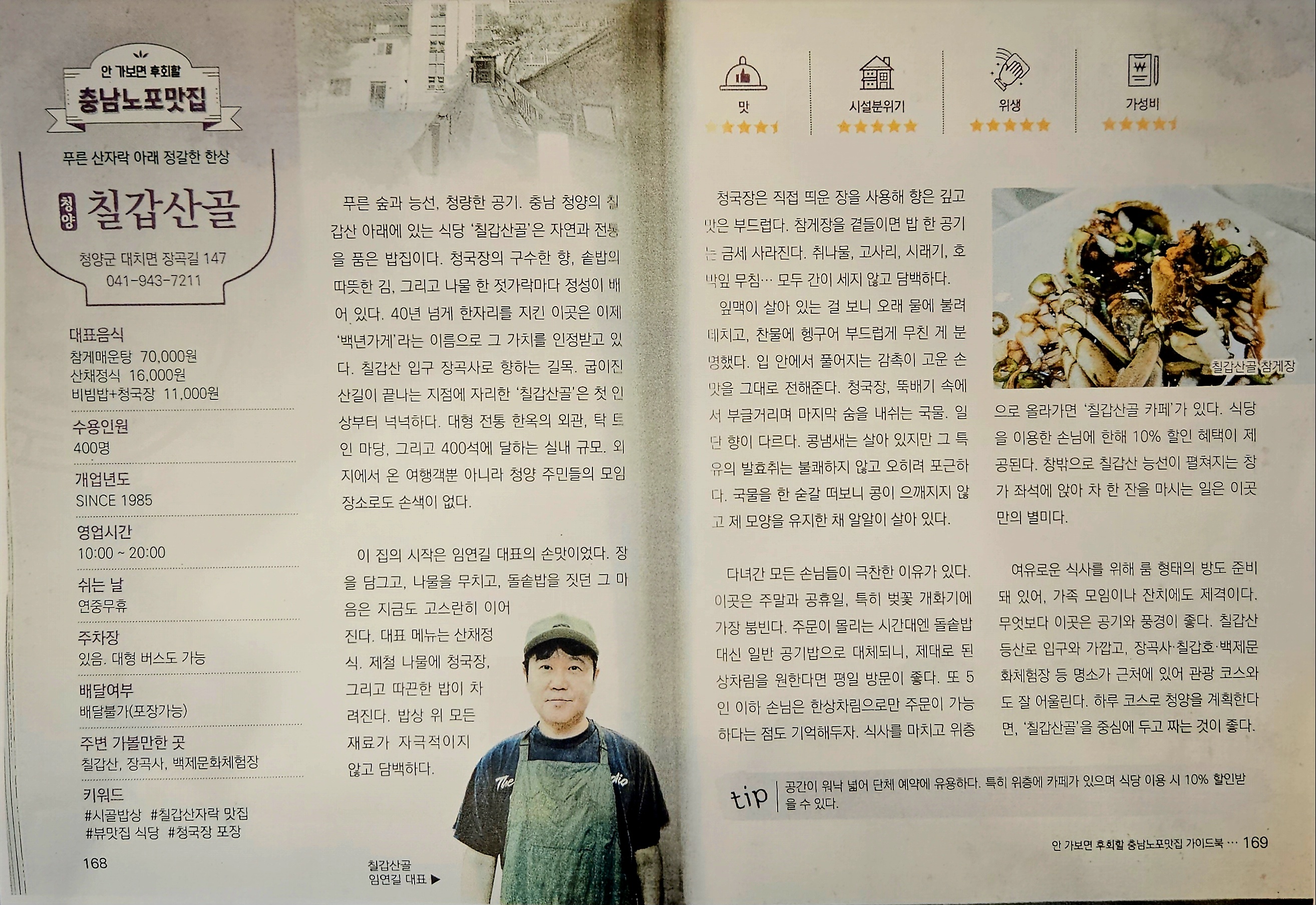 스시홀릭평소에 관광지 인근의 식당들은 잘 안 가게 되는데요, 현지에서 오랫동안 거주하신 분이 추천한 장곡사 인근 칠갑산 장승공원의 산채정식 식당입니다. 청양 칠갑산골. 식당 규모가 상당한 만큼 주차장은 걱정 없고, 식당도 대부분 프라이빗 한 공간이 많아 가족들이 방문해도 좋을듯합니다. 사실 현지 분이 여기보다 더 작고 맛있는 집을 소개했는데 휴무라...ㅠㅠ 지인분이 미리 예약을 해서 준비가 된 상태... 왼쪽 기본찬 가운데 도라지 무침과 파김치가 맛깔나고... 오른쪽 기본 찬에서는 촌두부와 가오리 회 무침 맛이 아주 근사했습니다. 가오리회 무침은 맛이 좋아 나중에 단품으로 따로 주문해 먹었을 정도... 막걸리는 앉은뱅이 술이라는 칠장주... 7가지 곡물로 빚어서, 혹은 7명의 장군이 마신 술이라 칠장주라고 하는데 뭐가 맞는지는 모르겠습니다. ㅎㅎ 아무튼 요즘 막걸리와 달리 과한 단맛 없이 묵직한 질감이라 맛있게 마셨네요... 먼저 돼지수육에 눈길이 갔는데요... 수육의 온도감도 좋고, 지방의 때깔이 근사했는데요, 돼지비계 안 좋아하는데, 아이스크림처럼 달달하게 녹아내리는 지방맛이 아주 맛있었습니다. 도톰하게 부쳐 낸 도토리 전도 매콤한 맛과 아삭하게 씹히는 맛이라 묵직한 칠장주와 잘 어울렸습니다. 기본찬으로 나온 게 너무 맛있어 따로 주문한 가오리 회 무침... 어찌나 입에 착 붙는 감칠맛이 좋은지, 잠깐 여기가 남도인가 했습니다. 식사는 동태탕... 이 첩첩산골에 웬 동태탕? 했는데요... 이집 사모님 손맛이 좋습니다. 칼칼한 국물 맛이 좋아 선도가 그렇게 좋은 것 같지 않은 동태찌개도 맛있습니다. ㅎㅎ 그리고 청국장찌개... 밥에 올려 슥슥 비벼 먹기에 좋을 정도로 심심한 간에 씹는 맛까지 고소한 콩 질감이 살아있는 청국장도 맛있습니다. 여기에 칠장주 한 잔 시원하게... 칠갑산에 또 언제 오게 될지 모르겠지만, 야들야들 맛있는 돼지수육과 가오리 회 무침 때문에 자꾸 생각날 거 같습니다. 잘 먹었습니다.