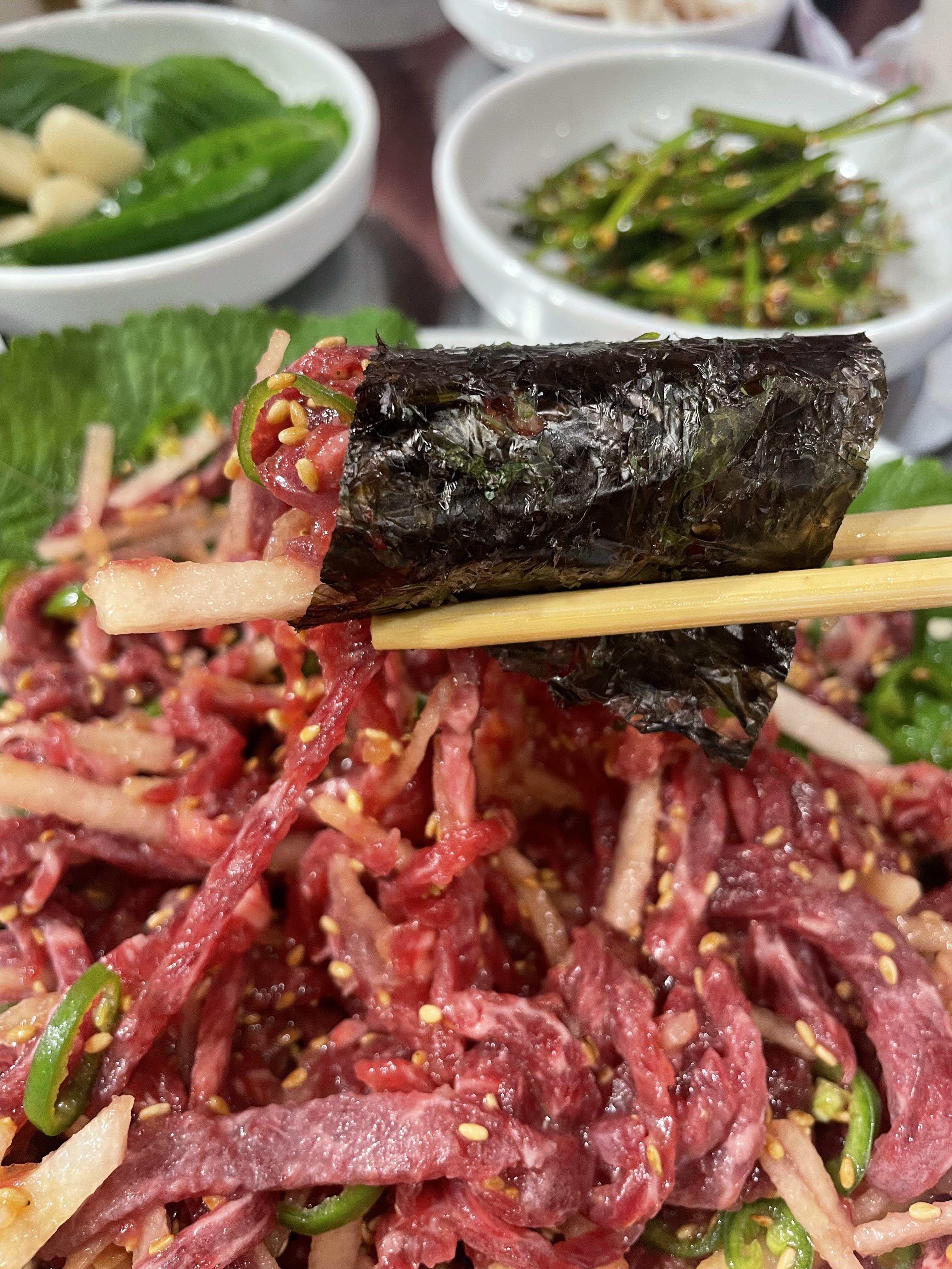 안녕30차돌삼합조합 미쳤어요..👍 육회도 완전 짱맛도리 가게까지 걸어오는데 여기만 사람이 꽉 인기많은 이유를 알겠어요 걍 신선하고 맛있습니다ㅋㅋ강추!