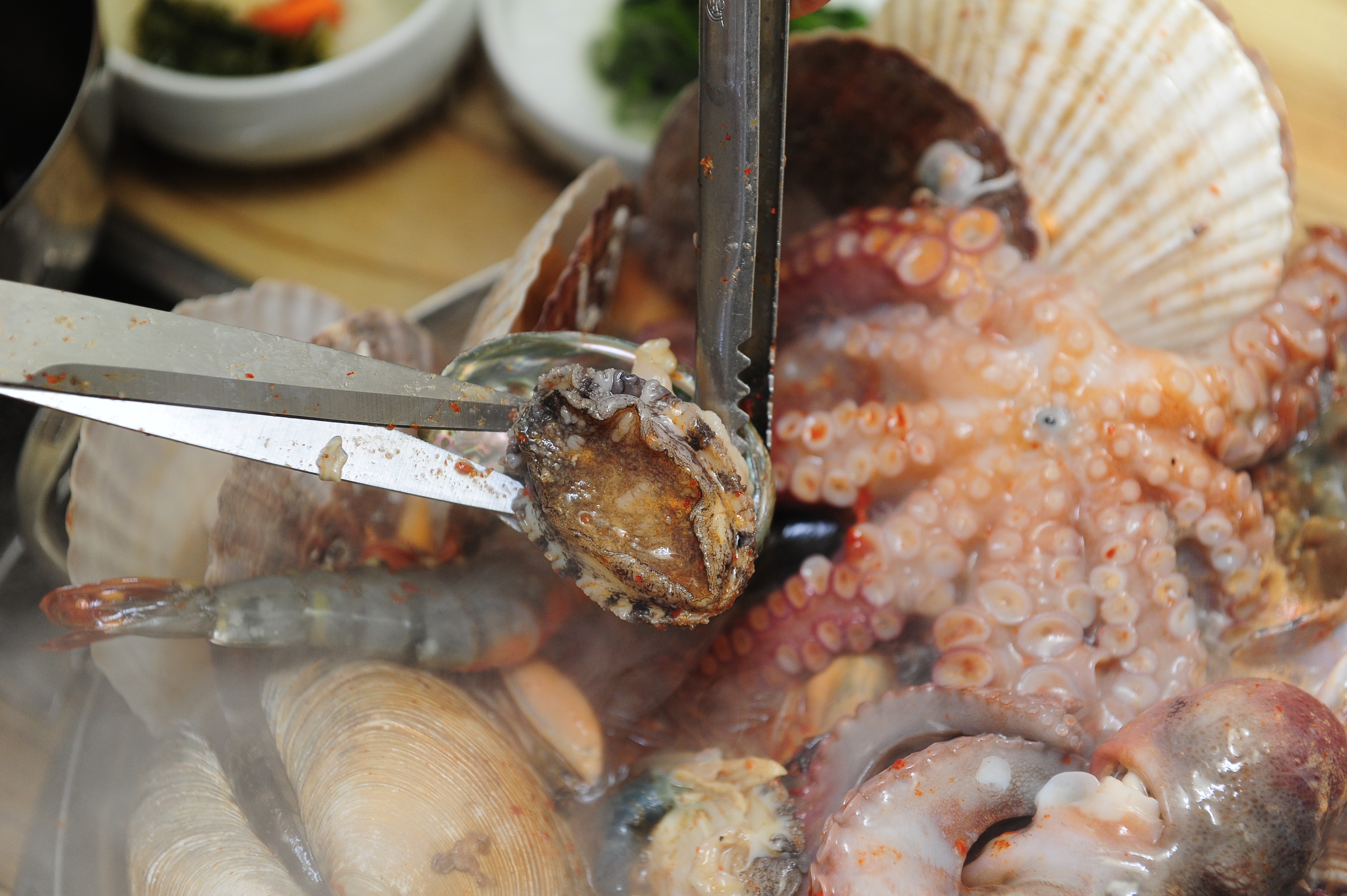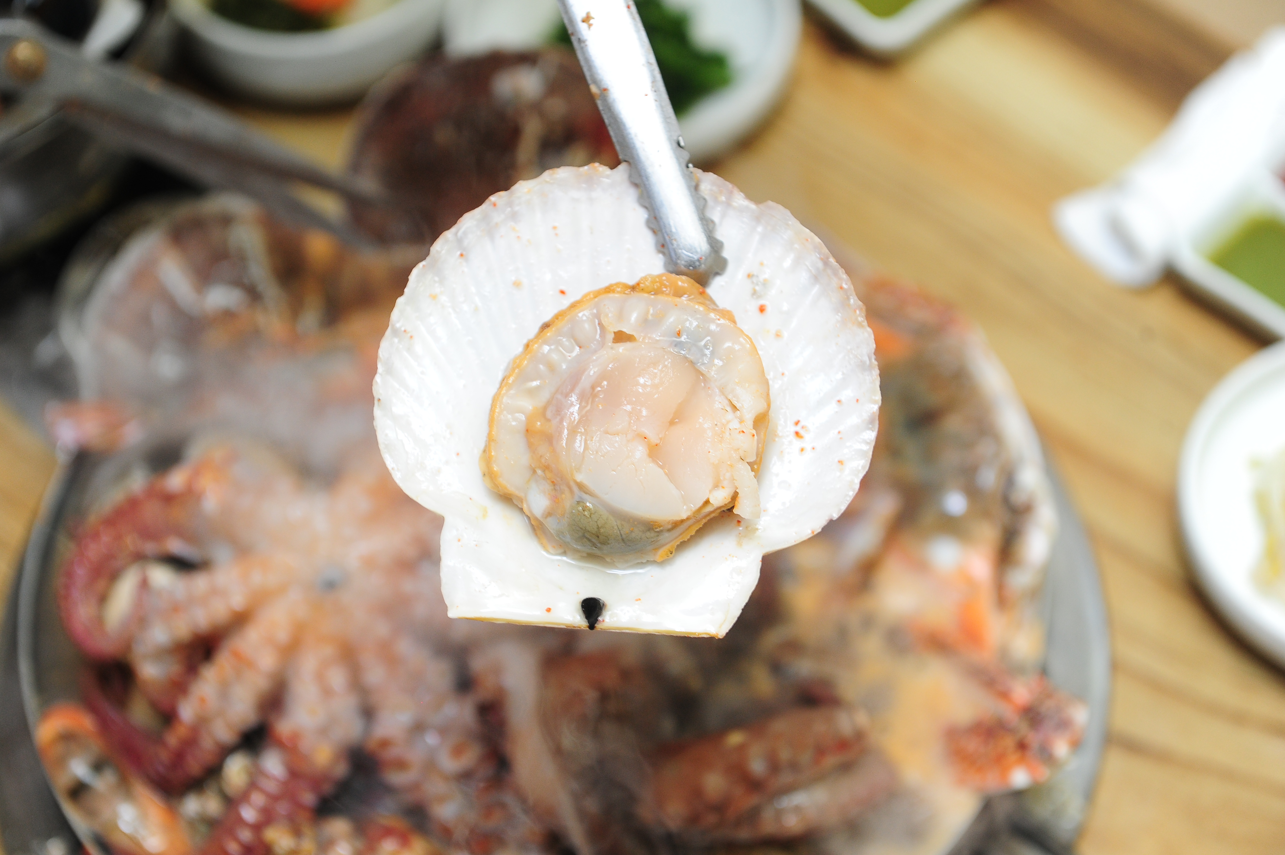 JJ1216대왕 문어, 가리비, 홍합, 꽃게, 전복, 새우 등이 산더미처럼 쌓여 나오는데 해산물이 냄비에 꽉 채워져 양이 매우 푸짐해요. 해산물이 많이 들어가서 국물이 정말 시원하고 깊은 감칠맛이 나요. 맑고 개운하며 적당히 칼칼한 맛이 해장으로도 좋고 술안주로도 훌륭해요. 밑반찬으로 백김치 국물, 도토리묵, 콩나물, 김치 등 반찬이 깔끔하고 정갈해요. 사장님의 친절함도 좋았어요 해물탕 맛집인거 인정 합니다.^^ 근처 수산시장 주차장을 이용할 수 있는데 주말이라서 주차하기가 힘든거 외엔 괜찮았어요.