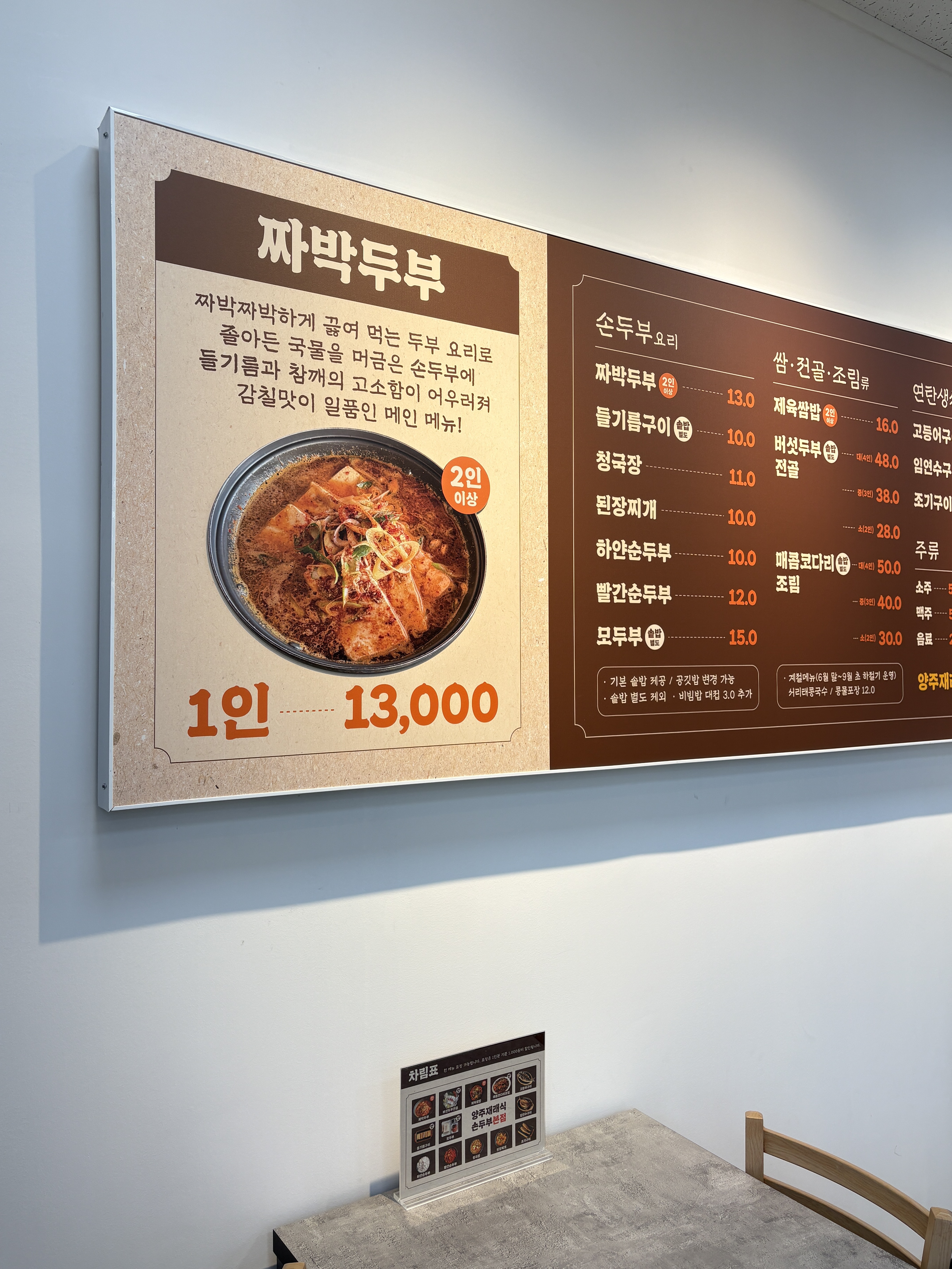 바이올렛제이매번 손님이 많은 양주 재래식손두부 본점. 부담 없는 두부 요리가 메인이라 가족 단위 식사나 부모님 모시고 오기 좋은 식당이라 매번 손님이 많았는데 기존 본점 바로 옆으로 신관이 새로 오픈했어요. 재래식손두부라는 이름 때문에 왠지 오래된 식당 느낌이라는 생각이 드는데 새 건물로 옮겨 전체적인 분위기가 매우 깔끔해졌어요. 신관으로 옮겨 뒤편에 주차장이 주차공간이 넓게 있었지만 아무래도 점심시간에 손님이 몰리다 보니 주차공간이 부족했어요. 바로 앞에 위치한 기존 본점 건물 쪽에 주차를 하고 걸어오시는 분들도 있었어요. 영업시간: 8:30~ 20:50 라스트오더: 20:20 신관(본점) 연중무휴로 운영되고 있어요. 그전 본관에 비해 실내가 넓고 쾌적해져서 식사를 하기 더욱 편해졌어요. 4인 테이블끼리 붙어있어서 옆 테이블과 붙어있는 부분은 아쉬웠어요. 대신 테이블이 길게 배치되어 있는 부분이 많이 있어서 단체로 오기 적합해 보여요. 양주 재래식 손두부의 대표 메뉴는 바로 짜박 두부예요. 자극적인 양념이 아니라 두부 자체와 들기름의 고소한 맛이 중심이 되는 메뉴라 부담 없이 누구나 좋아할 만한 맛이에요. 실제로 주변의 대부분의 손님들이 짜박두부를 주문했어요. 양주 재래식 손두부 본점은 tv프로그램에도 소개가 되었는데 대표적으로 식객 허영만의 백반기행 214회에 짜박두부가 나왔다고 해요. 두부를 만들고 나오는 콩비지는 무료로 나눠주셔서 집에서 끓여 먹을 수 있어요. 매장 한편에 있는 셀프바에서 반찬을 추가해 가져다 먹을 수 있는데 반찬을 판매하기도 하시더라고요. 맛있는 반찬은 구매해서 집에서 먹을 수 있어요. 짜박두부와 함께 다양한 나물 반찬으로 자극적이지 않은 속이 편안한 식사가 가능해요. 솥밥까지 한상 차림으로 나와 마무리 누룽지로 든든하고 따뜻하게 식사할 수 있어요. 나물 위주의 밑반찬이 다양하게 나오는데 같이 나온 반찬들이 양념이 세지 않아 두부 맛을 가리지 않았어요. 두부가 슴슴한 편이라 도라지무침과 고추장아찌 같은 몇 없는 새콤한 반찬에 저절로 손이 갔던 것 같아요. 짜박두부 짜박두부는 간이 세지 않아서 첫 입엔 조금 싱겁다고 느껴질 수 있는데 먹다 보면 양념이 쫄아서 들기름과 두부의 고소한 맛이 두배가 되어 어른들이 좋아할 맛이었어요. 두부가 부드럽고, 양념이 과하지 않아서 다 먹고 나서 입이 짜지 않고 속이 편안한 느낌이었어요. 이 집이 짜박두부를 메인으로 내세운 이유가 딱 이해되는 맛이었어요. 하얀 순두부 위내시경을 받으신 시어머님은 속이...