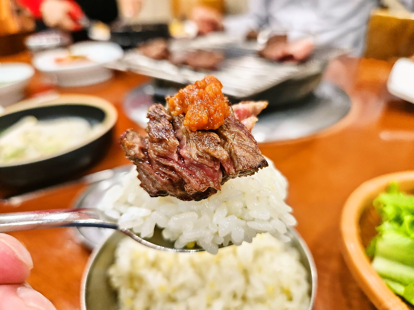 Reim새로나온 메뉴, 소고기 샤브만두전골 이던가요? 간이 슴슴하고 국물도 시원해서 보양식 먹는 기분! 김치만두, 고기만두 같이 있어서 2가지 맛 보기 좋고 고기집이라 그런지 고기도 연하고 맛있었습니다. 먹고 칼국수면까지 넣어서 먹으면 딱이에요! 반찬 너무 정갈하게 맛있었어요~ 오이고추된장무침? 그리고 고소한 참기름 냄새 담긴 봄동^^