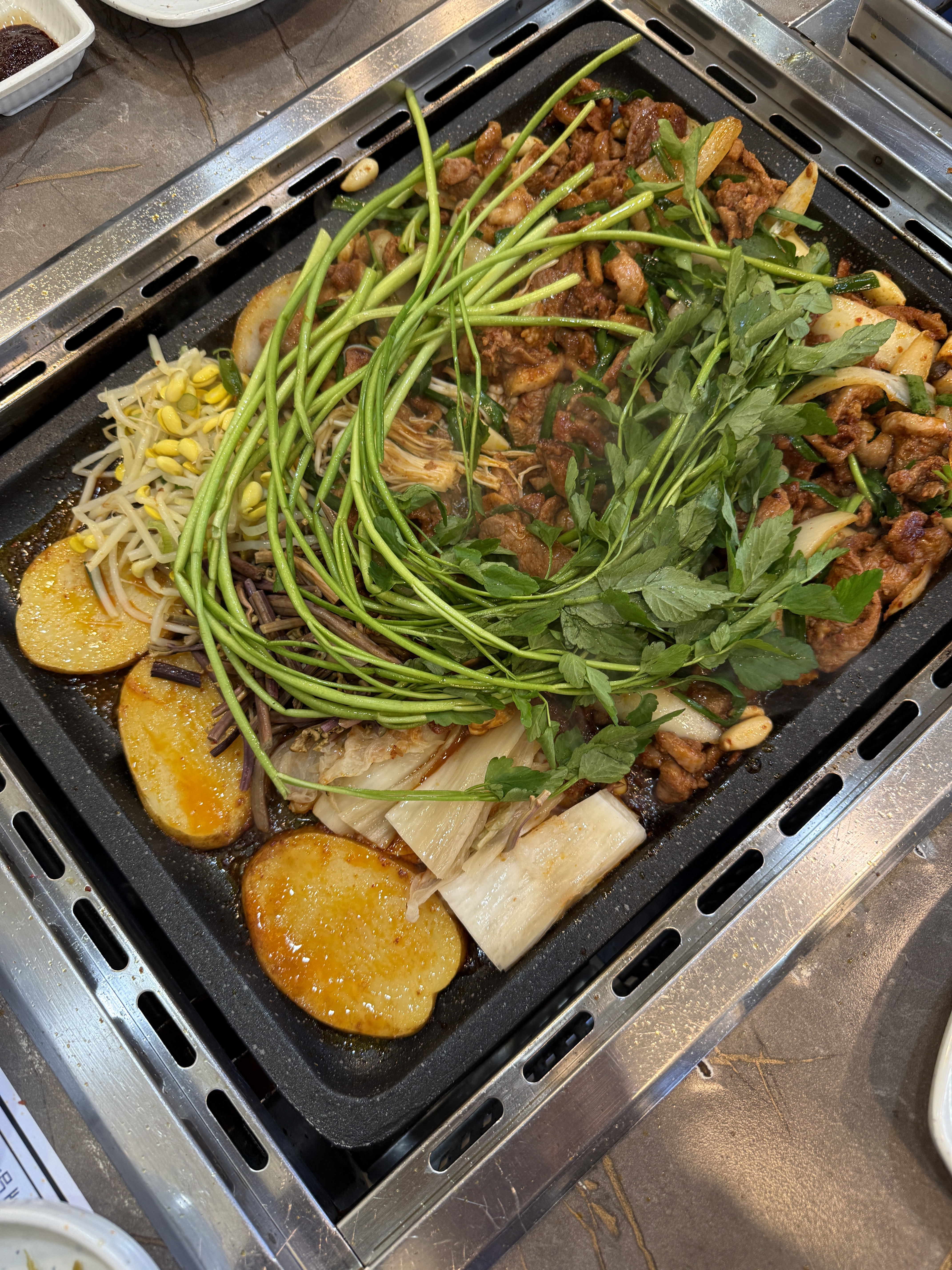 잡내 없고 구성 알찬 '도원돌판오리' ​오리 고기 선도가 정말 훌륭합니다. 선홍빛 육질부터 신선함이 느껴지는데, 구웠을 때 잡내 없이 담백하고 고소한 맛이 일품이네요. ​특히 돌판 위에서 오리 기름에 함께 구워 먹는 감자, 콩나물, 고사리, 부추의 조화가 예술입니다. 채소 구성이 워낙 다양해서 마지막까지 질리지 않고 풍성하게 즐길 수 있었어요. 건강하고 든든한 보양식 한 끼로 손색없어 다시 방문하고 싶은 곳입니다. 강력 추천해요!