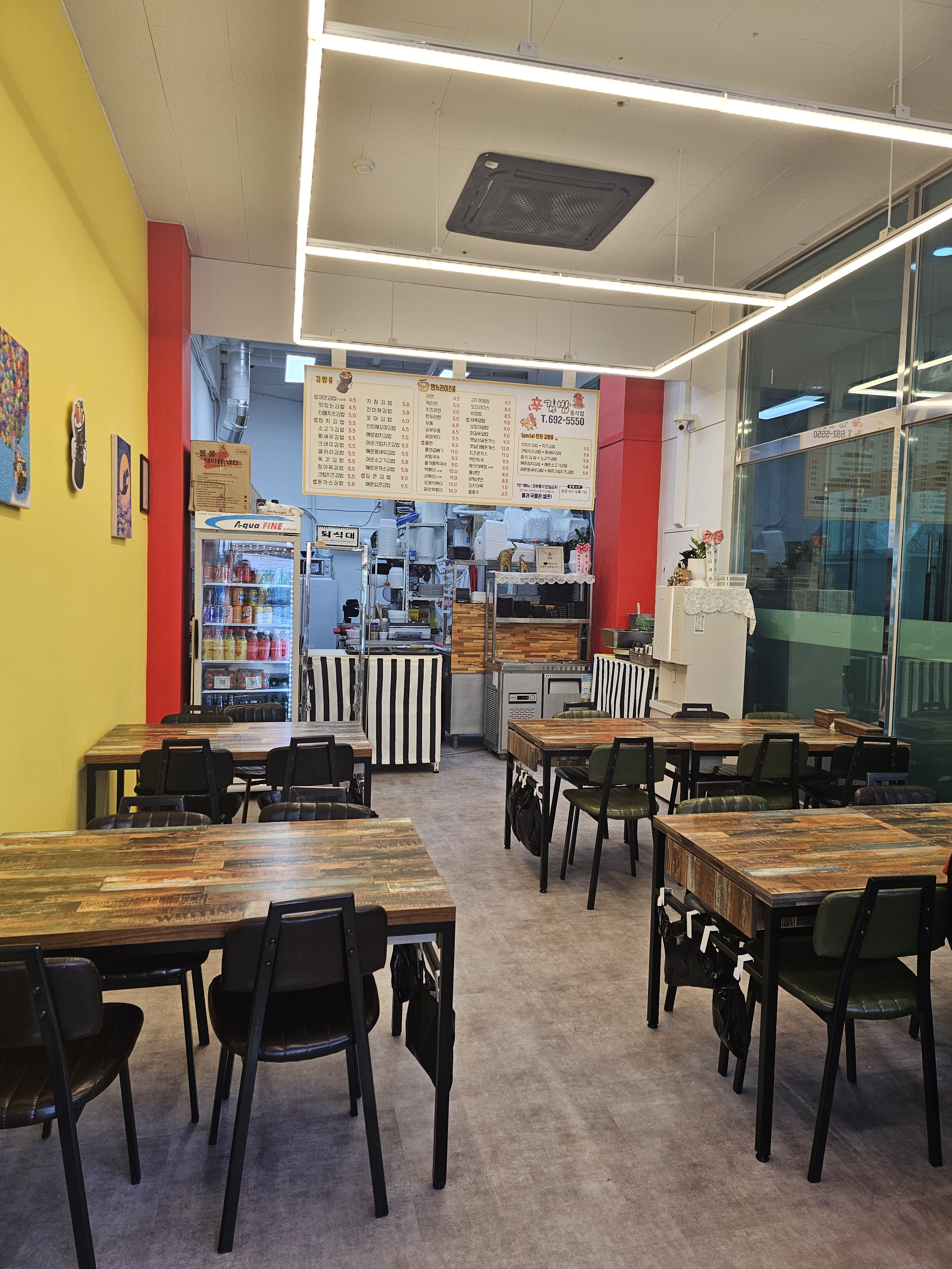 찐빵룽댕댕이 산책 후 아점으로 간단히 먹으려고 김밥 포장해왔어요! 매장 내부는 키오스크로 주문해서 간편하고 좌석도 많아서 혼밥, 연인, 가족끼리 와도 좋아요! 입큰 김밥은 어떻게 나올까 궁금해서 시켜봤는데 제 손바닥 만해서 하나 먹어고 금방 배부르더라구요 소식가들은 나눠서 반줄씩 먹어고 괜찮을 거 같아요^~음식은 짜지않고 제 입맛에 맞았습니다! 다음엔 매콤한 김밥 먹어보고 싶어요~ p.s 먹는데 옆에서 강아지가 탐내해서 한번 찍어봤어요!