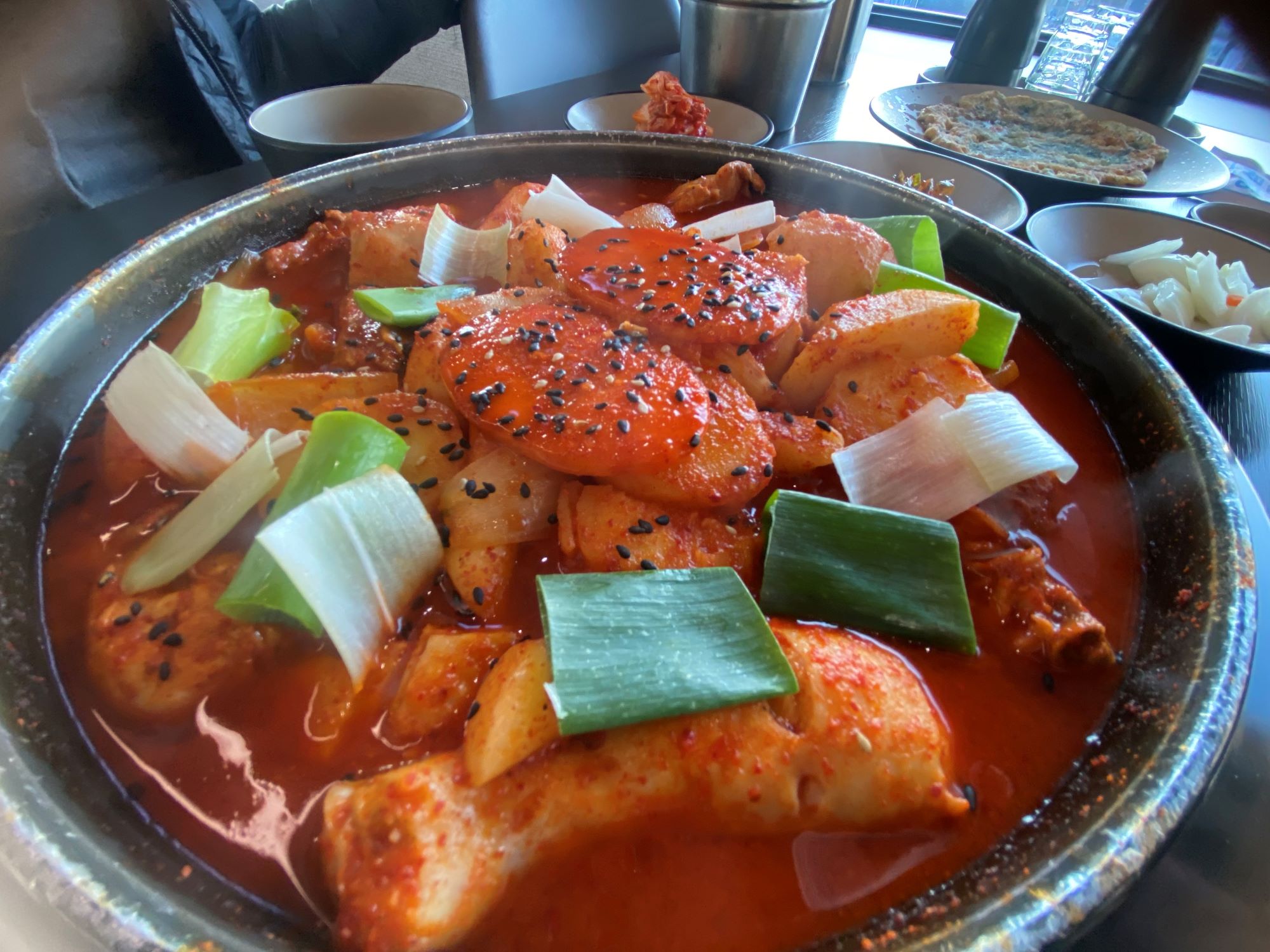 지유우1년 만에 다시 찾은 찐맛집 12월의 어느 주말 정오 친구들과 함께 상록수역에 있는 조순금닭도리탕을 찾았어요. 작년에 교회 모임에서 처음 가봤는데 첫 입에 반해버린 그 맛이 1년 내내 머릿속을 맴돌았거든요. 드디어 친구들이랑 시간을 맞춰서 오게 됐는데 내 찐맛집을 소개해준다는 생각에 두근두근했어요. 조순금닭도리탕 정보 위치: 경기 안산시 상록구 본삼로 39, 6층 (상록수역 3번 출구 도보 5분) ⏰ 영업시간: 화~일 11:30~21:50 (월요일 휴무) 가격: 중(2~3인) 36,000원 / 대(4인) 53,000원 ⚠️ 노키즈존 (초등학생 미만 입장 불가) 닭도리탕 집이 이렇게 고급스러울 수 있다고? 문을 열고 들어서자마자 친구들이 "여기 진짜 닭도리탕 집 맞아?" 하는 반응이 나올 정도로 분위기가 깔끔하고 세련됐어요. 테이블 사이 간격도 넓어서 옆 테이블 눈치 볼 필요가 전혀 없더라고요. 그래서 편하게 친구이랑 맘편하게 밥을 먹었습니당 ㅎㅎㅎ 카운터 옆에 세면대가 있었는데 엄청 깨끗하고 감각적이었어요. 동그란 거울에 나무 세면대까지 디테일 하나하나 신경 쓴 게 느껴졌어요. ✅ 노키즈존 운영 초등학생 미만 어린이는 입장이 불가능해요. 대신 조용하고 편안한 분위기에서 식사를 즐길 수 있어요. 조순금닭도리탕은 40년전통, 3대에 이어진 전통 맛집입니다. 마늘숙성이 조순금의 맛이 비법이에요:) 그리고 닭도리탕 단일메뉴라서 맛이 달라지지 않고 계속해서 상록수역 맛집으로 롱런하는 곳이에요! 메뉴 선택은 고민할 것도 없이 우리는 3명이라 중(36,000원)을 주문했어요. 메뉴판을 보니 추가로 1인당 4,000원만 내면 밥을 더 먹을 수 있더라고요. 자리에 앉으니 예쁜 트레이에 컵과 타이머가 담겨 나왔어요. 바로 직원분께서 물도 주셨습니다. 이 타이머가 무슨 용도인지는 나중에 알게 됐는데 진짜 센스 있는 아이디어였어요. 그리고 본격적인 맛의 여정이 시작됐어요. 닭도리탕이 나오기 전에 에피타이저로 부침전을 주셨는데, 이게 진짜 맛있었어요! 겉은 바삭하고 속은 촉촉한 전이 입맛을 확 돋워줬어요. 전과 함께 같이 나온 기본 반찬도 함께 나왔는데 깔끔하고 정갈했어요. 드디어 등장한 대망의 닭도리탕 짜잔! 드디어 우리가 기다리던 닭도리탕이 나왔어용. 빨갛고 윤기 나는 국물에 통통한 닭고기와 떡 감자 야채들이 가득 담겨 있었어요. 5분의 기다림이 만드는 마법 감자와 떡은 바로 먹어도 되지만, 닭고기는 5분 정도 더 익혀야 해요. 테이블에 있던 타이머를 뒤집어서 기다리면 딱 맞아요! 5분을 기다리는 동안 김이 모락모락...