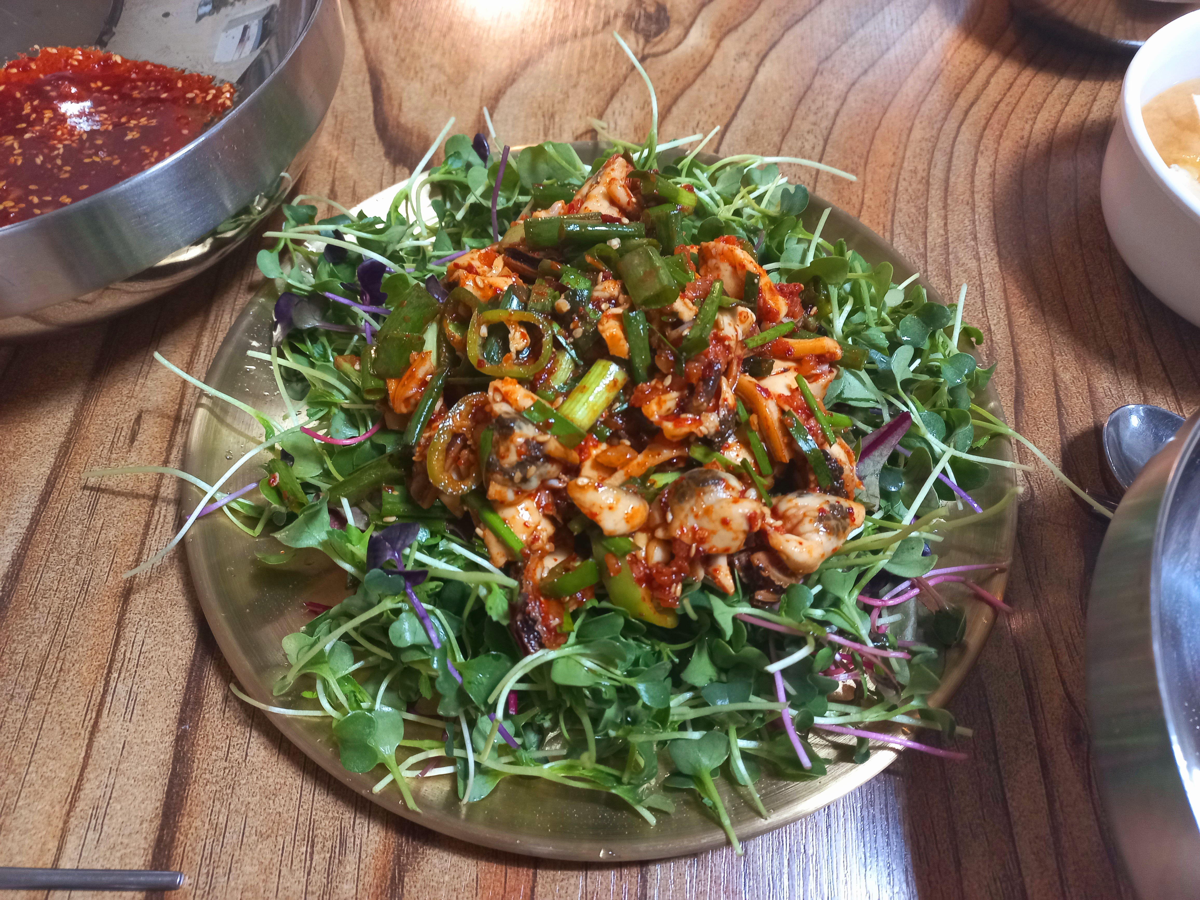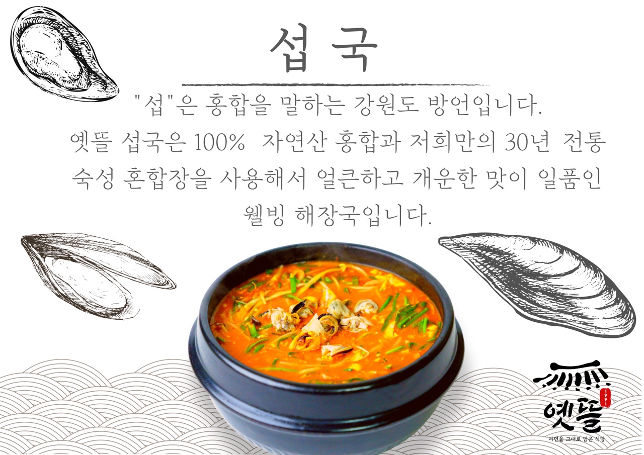 빛밝음섭은 자연산 홍합을 부르는 우리말이랍니다 '홍합이 얼마나 맛있겠어' 하고 시큰둥했던 일행들은 완전 반해서 땀을 뻘뻘 흘리며 홀릭했구요 심지어 다음주에 가족들 데리고 다시 온 친구도 있었답니다 어디를 여행하나 맛난 음식을 먹는 것은 여행에 빼놓을 수 없는 즐거움이지요 양양 옛뜰입니다 늦은 점심에 갔는데 저희는 마지막 빈자리를 차지했지만 저희 뒤로 제법 웨이팅들 하셨어요 웅장한 울산바위와 그 얼큰한 섭탕이 또 생각나네요