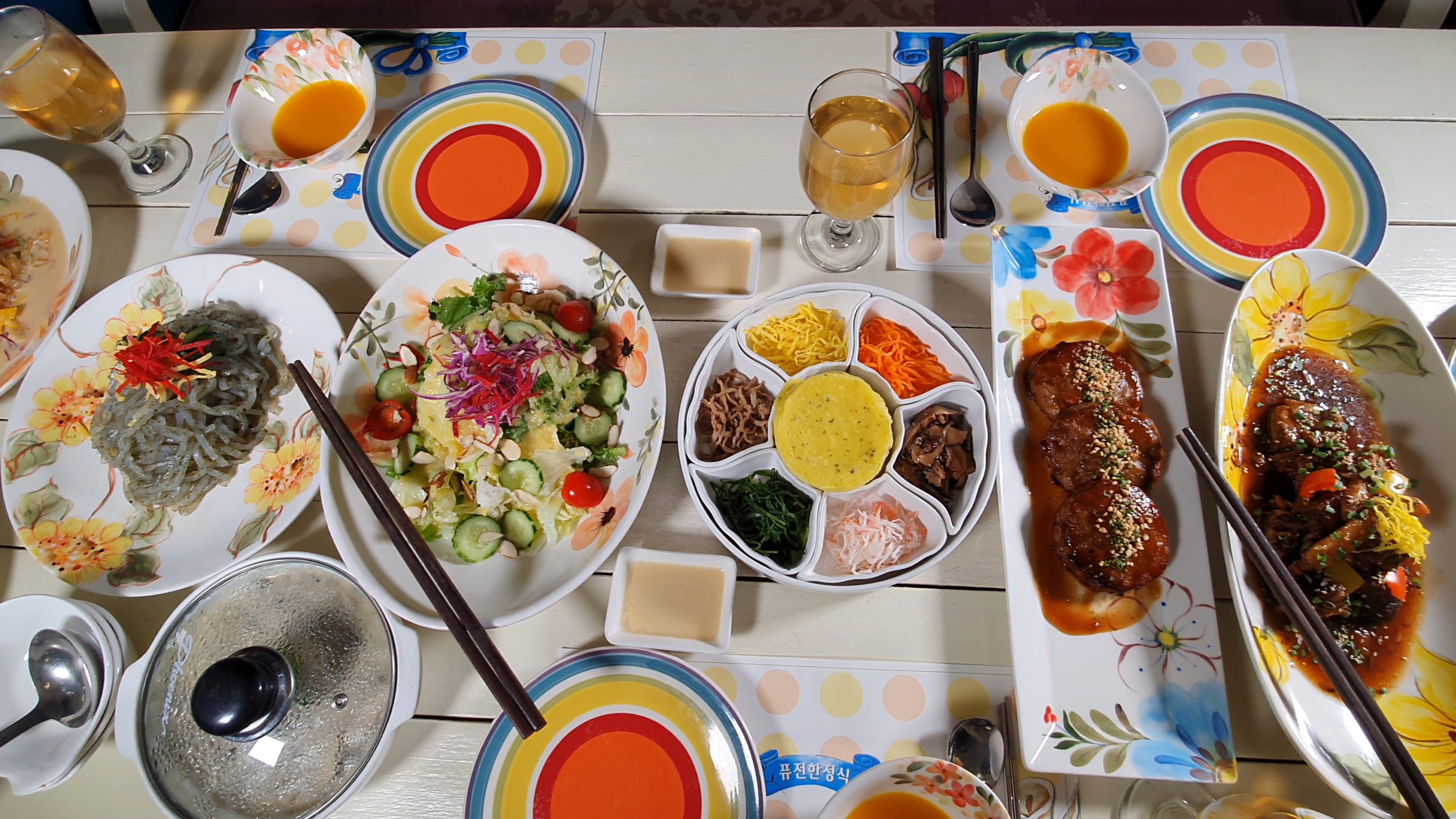 앙꼬2남친이 서치 한 파주 타샤의정원 퓨전한정식 이에요 매장이 넓고 층고가 높아서 개방감 좋고 답답하지 않은 인테리어가 빈티지 스러운 타샤의정원 식기류 가 엄청 화려해요 ㅋㅋ 라일락 4.5 타샤의정식 3.5 코스 있는데 라일락 에 세가지 메인이 더 추가되 있어요 (소갈비찜 .해파리냉채 .크림새우) 저희는 라일락 주문했어요 얼마 전 에 친구들이랑 먹었던 한정식 보다 메뉴 구성도 좋고 맛있었어요 식사 솥밥 된장찌개 밑반찬도 맛있구요 식당 입구가 예뻐서 영상 찍어봤는데 어떠신지 꽃이 피는 계절에 오면 더 예쁠것 같아요 식사 후 후식 안드시면 앞 카페 더티트렁크 할인 권도 주신데요 저희는 갈곳이 있어서 패스!! 주말인데 붐비지 않고 조용히 식사 잘했어요