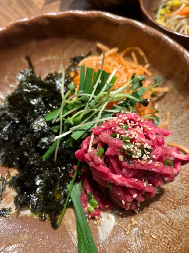 안방 뮤지컬육회가 정말 촉촉하고 맛있어요. 양념장의 감칠맛과 달짝지근함은 길쭉한 야채들과 재미있게 씹혀서 즐겁습니다. 매콤할 즈음 미역국이나 묵으로 달랠 수 있어 좋아요. 전 반찬의 콩나물도 같이 비비니 더 맛있네요.