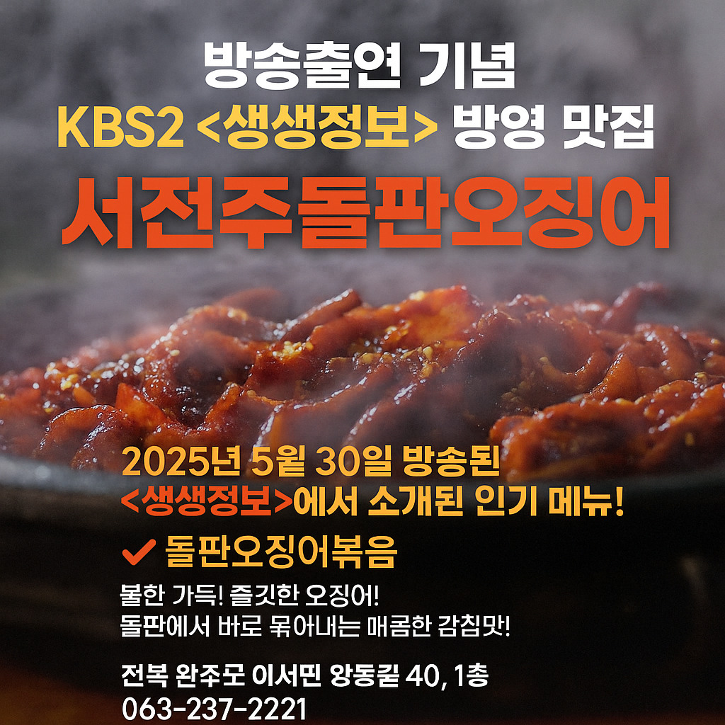 kGn뉴스생생정보통 고수의부엌 돌판오징어볶음 완주 서전주돌판오징어 생생정보통 고수의부엌 돌판오징어볶음 완주 서전주돌판오징어 KBS 2TV의 생생정보는 저녁 시간에 방송되는 인기 정보 프로그램으로, 매일 새로운 유용한 정보를 제공하며 시청자들의 일상에 도움을 주고 있습니다. 많은 사람들이 즐겨보는 프로그램으로 자리 잡았습니다.이번 생생정보 고수의부엌 에서는 식지 않는 화끈한 맛! 돌판오징어볶음이 소개됩니다 아래에서 생생정보 고수의부엌 돌판오징어볶음 주문 해보시기 바랍니다 생생정보 고수의부엌 돌판오징어볶음 주문 이번 생생정보 ‘고수의 부엌’에서는 시간이 지나도 식지 않는, 입안을 화끈하게 자극하는 매운맛의 진수를 보여주는 돌판오징어볶음이 소개됩니다. 보통의 볶음요리와는 차원이 다른, 눈앞에서 지글지글 끓으며 식탁 위에 올려지는 이 돌판요리는 시각과 후각을 동시에 자극하며 손님들의 입맛을 제대로 사로잡습니다. 돌판오징어볶음의 가장 큰 특징은 바로 '돌판'에 있습니다. 일반 철판이나 팬이 아닌, 두껍고 열을 오래 간직하는 돌판을 이용해 조리되기 때문에 마지막 한입까지도 따뜻하게 먹을 수 있다는 것이 장점입니다. 이 돌판 위에 매콤한 양념에 버무린 오징어와 각종 채소를 올려 내면, 눈앞에서 계속해서 보글보글 끓으며 먹는 재미를 더해줍니다. 불판에 직접 닿은 양념은 살짝 눌어붙으며 특유의 불맛을 만들어내고, 시간이 지날수록 재료가 졸아들며 더 진하고 깊은 맛을 냅니다. 오징어볶음의 핵심은 무엇보다 ‘양념’입니다. 단순히 맵기만 한 양념이 아니라, 달큰하면서도 감칠맛이 도는 이 집만의 특제 양념은 수차례의 실험 끝에 완성된 것입니다. 고춧가루와 고추장, 다진 마늘, 간장, 설탕은 물론 각종 채소에서 우러나온 육수까지 더해져 입 안에서 퍼지는 풍미가 남다릅니다. 입맛이 없던 날에도 이 돌판오징어볶음을 한 입 먹으면, 밥 한 공기는 순식간에 사라지게 됩니다. 보통 돌판오징어볶음에는 오징어 외에도 양배추, 양파, 깻잎, 부추, 당근 등 다채로운 채소들이 함께 들어갑니다. 여기에 떡이나 우동사리를 추가할 수도 있고, 고소함을 더하고 싶다면 모차렐라 치즈를 얹는 것도 가능합니다. 특히 치즈를 올리면 매운맛이 중화되어 맵찔이 입맛을 가진 사람도 맛있게 즐길 수 있는 메뉴로 변신합니다. 치즈가 녹아내릴 때쯤, 돌판에서 함께 끓는 오징어를 돌돌 말아 한 입 먹으면 매콤함과 고소함이 입 안에서 조화를 이루며 중독적인 맛을 선사합니다. 이 집에서는 오징어볶음을...
