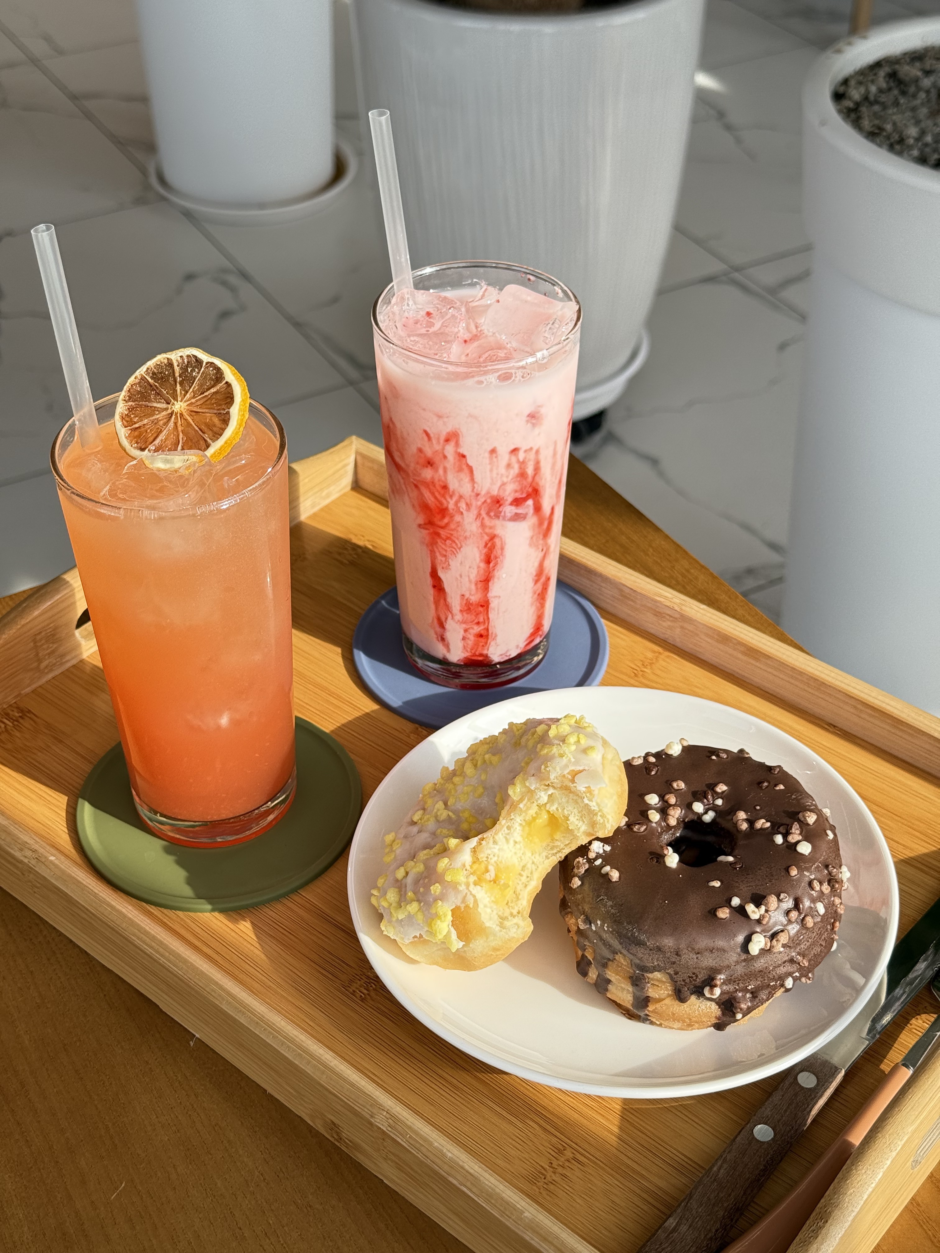 1차로 술이나 밥먹고 2차로 들리는곳인데요 던킨보다 훨씬 저렴하고 맛있어요! 오늘은 아이가 아이스티가 먹고싶다해서 할인가격으로 살수있는 딸기라떼랑 복숭아피치퐁당아이스티를 주문했는데 웬만한 카페보다 더 맛있네요??? 저렴한가격에 도넛이랑 음료를 먹을수있으니 너무 좋아요♡
