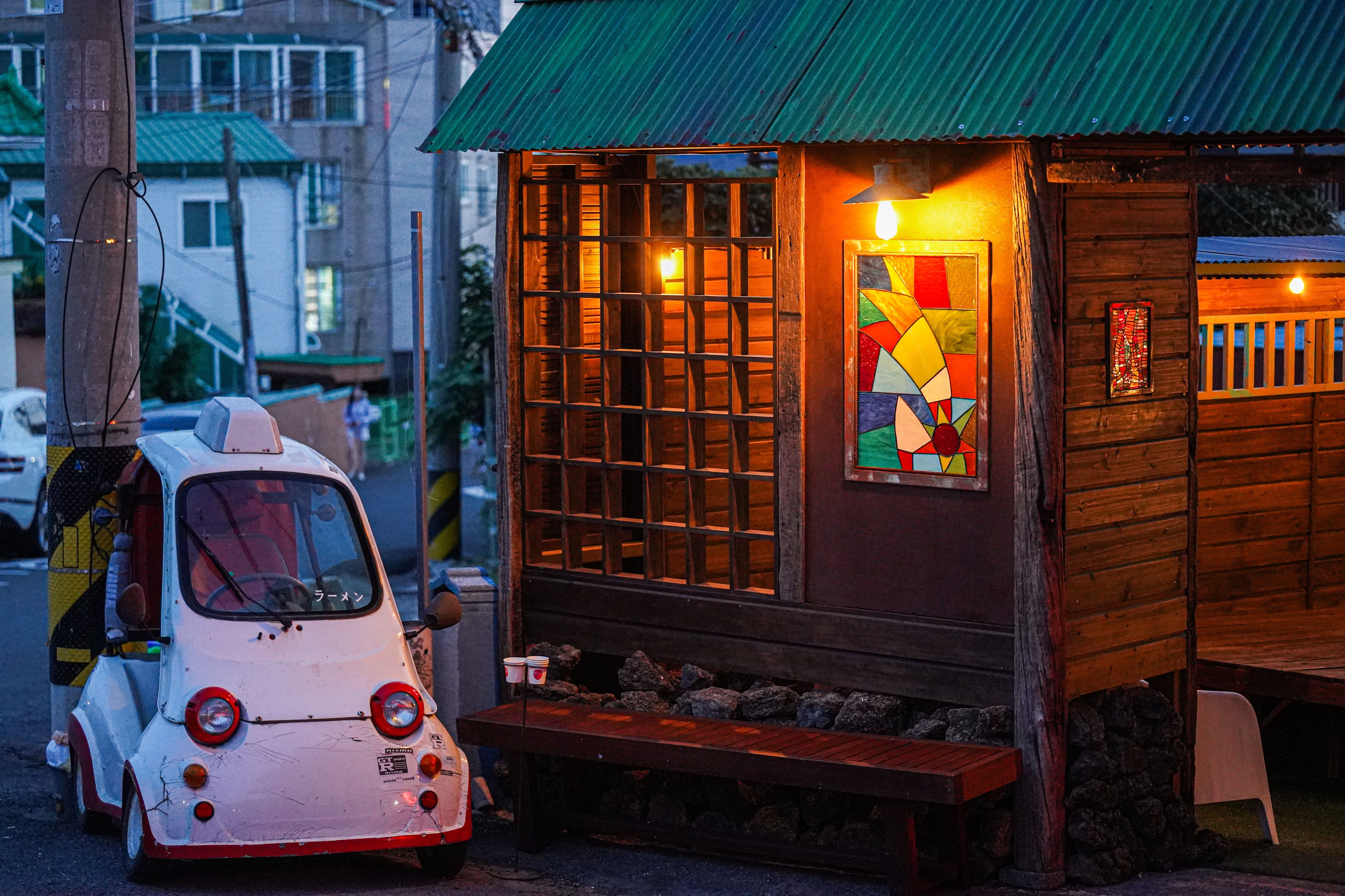 공부하는 해파리몇 년 전에 찾아가 봤던 진해 겐쇼 심야 라멘 오전 11시부터 새벽 2시 반까지 영업하는 라멘집인데 왠지 모르게 야심한 새벽에 찾아가는 게 제맛인 집이다. 전에 찾아갔을 때도 바람이 세차게 부는 추운 초겨울이었는데 이번에도 쌀쌀한 날씨의 늦은 밤에 찾아가게 되었다. 빨간 네온사인과 식당 앞에 주차된 오토바이 때문인지 이 식당만 다른 공간에 있는 듯한 느낌을 준다. 몇 년 사이 식당 내부가 많이 바뀌었다. 석등과 수반이 있는 일본식 정원과 대기를 기다리는 손님들이 앉을 수 있는 공간이 마련되어 있다. 추워 죽겠는데 왠지 모르게 열받는 따스하게 일렁이는 벽난로 영상 일본식 다다미 방처럼 생긴 공간도 있다. 기다리는 동안 심심할 손님들을 위해 대기 공간 겸 포토존으로 만들어둔 듯하다. 색연필과 메모지, 간단한 게임 도구들이 있다. 센과 치히로의 행방불명에 나오는 돌머리 삼총사 인형도 있다. 터키풍의 스테인드글라스 스탠드와 일본식 다다미 방, 돌머리 삼총사 인형의 묘한 시선 원래라면 잠자리에 들었어야 할 야심한 시각에 라멘을 먹기 위해 기다리는 이 상황이 어딘지 모르게 생경한데다가 묘한 인테리어가 주는 이질감 때문인지 순식간에 낯선 세계에 떨어진 듯한 기분이 든다. 식당 내부 역시도 독특한 느낌이다. 전체적으로 일본과 지브리 스튜디오의 느낌이 강하게 느껴지는 빈티지한 인테리어. 주문과 결제는 자리에서 바로 태블릿으로 가능하다. 라멘과 타코야끼를 시키고 싶었는데 타코야끼는 재료 소진으로 주문할 수 없었다. 라멘에 차슈 추가(11,500원) 심야라멘 고유의 돈코츠 육수에 파와 멘마,숙주 토핑, 짭조름한 맛계란과 부드럽고 기름진 차슈까지 듬뿍 올라간 라멘이다. 라멘 역시도 돼지국밥과 비슷하게 웬만큼 못 만들지 않고서는 보장된 맛을 자랑한다 생각한다. 따끈한 고기 육수에 꼬들꼬들한 면, 부드러운 차슈와 삶은 계란 조합은 맛이 없으려야 없을 수가 없다. 거기에 겐쇼 심야 라멘만의 독특한 분위기와 야심한 시각 라멘을 먹는다는 일탈의 느낌이 더해져 라멘이 더욱이 맛있게 느껴지는 것 같다. 교자 만두와 닭튀김 세트(7,500원) 바삭하게 튀긴 교자와 닭튀김 맛은 무난하다. 닭튀김과 함께 나오는 마요 느낌의 소스가 맛있었다. 아침에 퉁퉁 부은 얼굴을 하고 출근을 할지언정 새벽의 야식은 정말 즐거웠다.