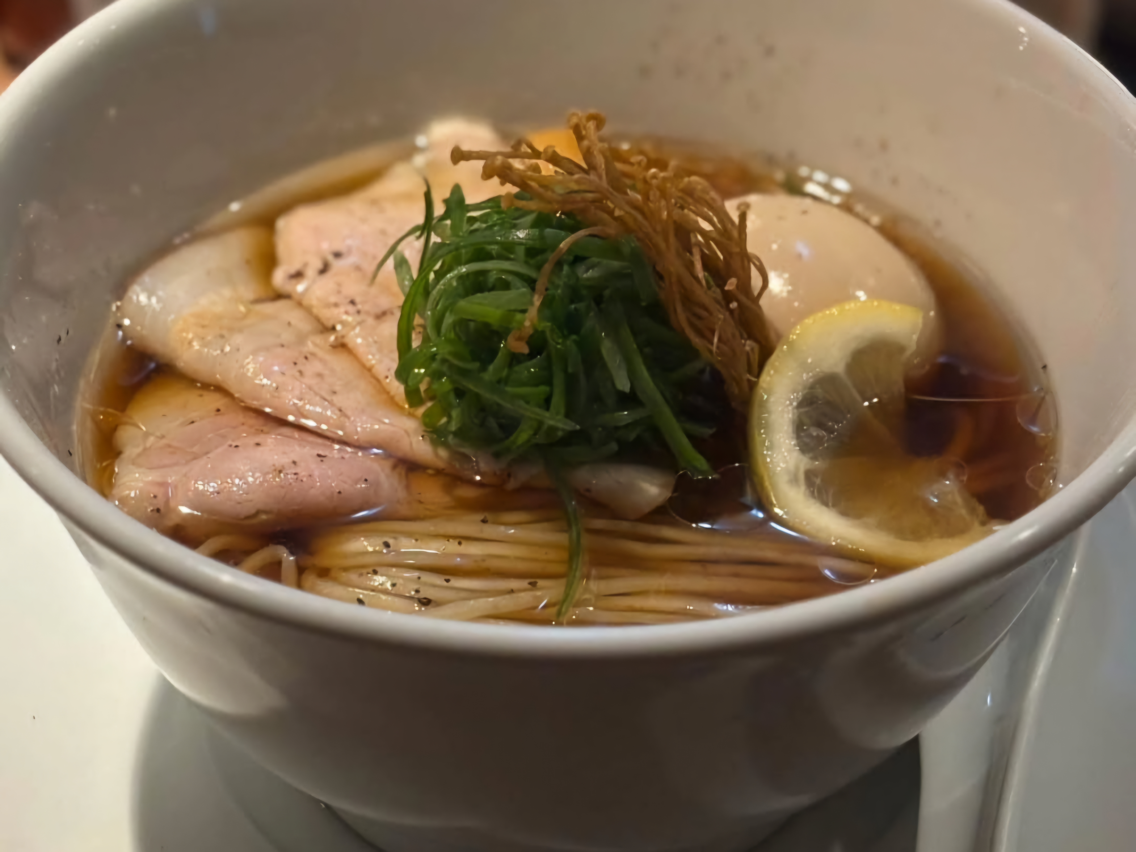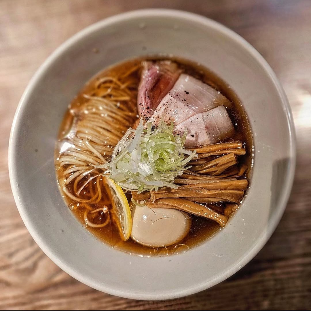 닭털핑크제주 구엄닭을 우려낸 토리친탕(鶏清湯) 기반. 유화 억제 추출로 투명도 유지. 표면의 얇은 닭기름은 가벼운 고소함 부여. 시오라멘은 점성이 낮아 입술에 점착되지 않는 깔끔한 질감. 토종닭 특유의 농축된 육향과 중간이상 바디감 형성. 정교한 염도 설계를 통해 직선적이면서도 복합적인 아미노산의 여운으로 강렬한 감칠맛을 전면에 내세운 풍미. 쇼유라멘은 닭 청탕 위에 간장 타레와 가쓰오부시 향미가 결합되어 잘 익은 사케 같은 발효향과 은근한 짠맛이 퍼지고 훈연 감칠맛이 깊이를 보강. 육수의 바디는 상대적으로 가볍지만 발효향과 어패류 감칠맛 풍미. 면은 저가수율 세면으로 단단한 식감과 육수 흡착력 확보. 차슈는 지방마블링 적고 균일한 근섬유, 얇은 껍질층의 등심 부위. 저온 조리를 통해 담백한 육질에 미세한 쫄깃함.