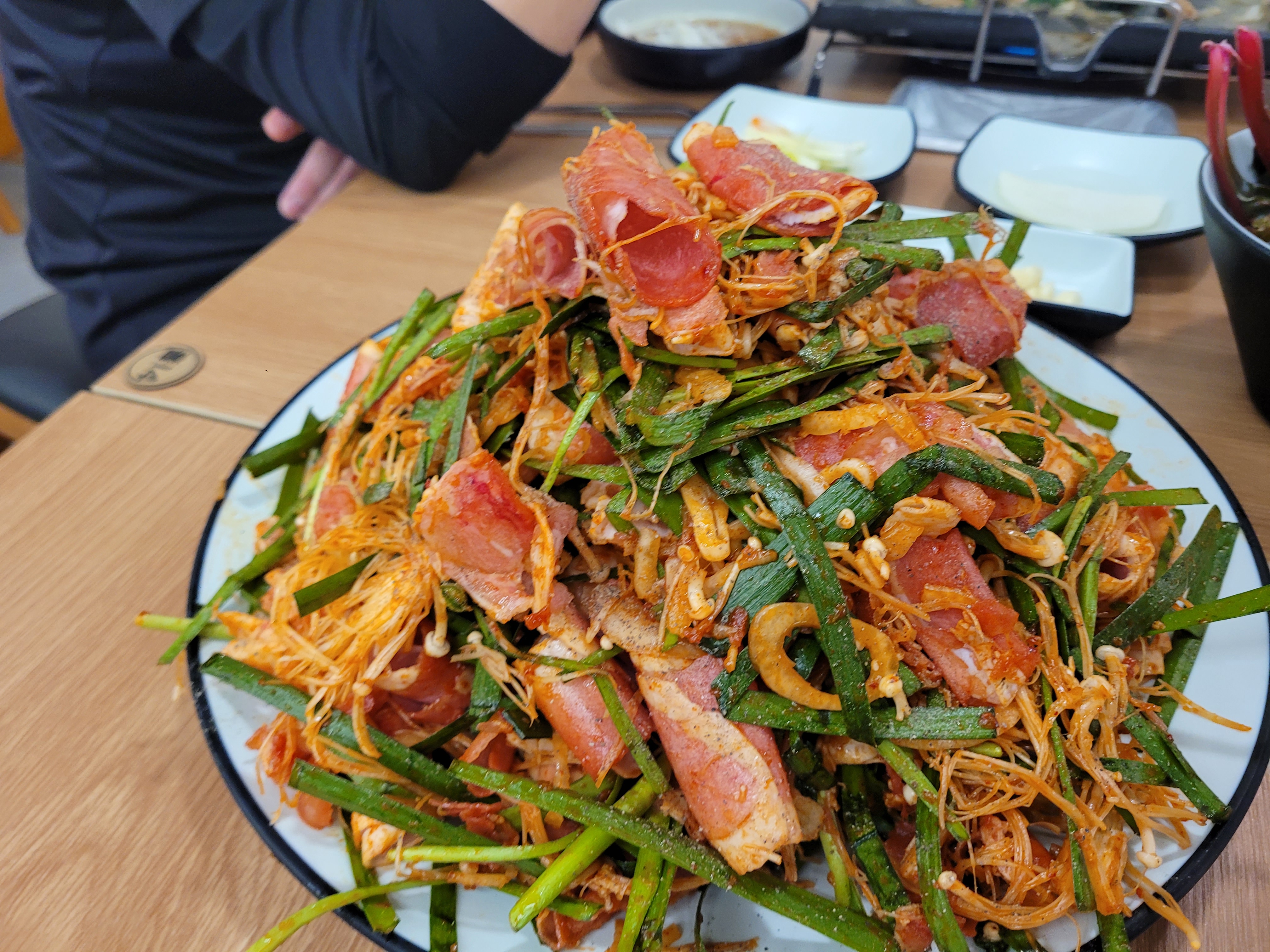 기어코오네오늘 대조명가 다녀왔는데 진짜 대박이에요! 불판 위에 신선한 오리고기랑 부추, 양파, 팽이버섯을 같이 구워 먹으니까 향긋함이 장난 아니더라고요. 고기 질이 좋아서 담백하고 채소랑 궁합이 찰떡이에요. 밑반찬도 하나하나 정갈해서 감동했어요. 특히 매콤달콤한 마늘 장아찌 무침은 아삭하니 고기랑 같이 먹으면 무한 흡입 가능해요! 시원한 백김치로 입가심까지 해주면 완벽한 한 끼예요.