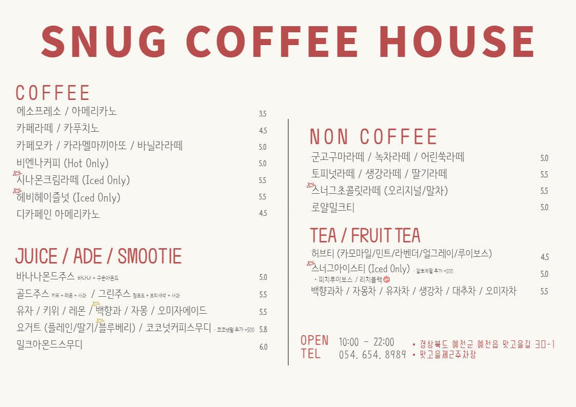 경북 예천군 예천읍 맛고을길 30-1 스너그커피하우스
