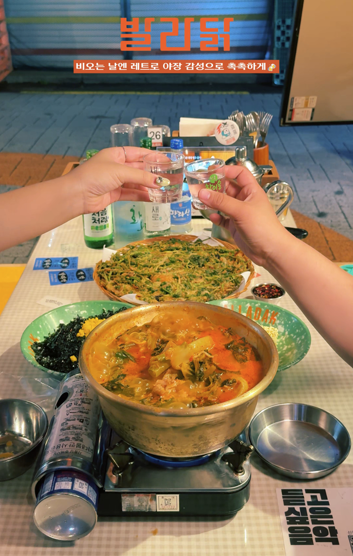 니나 NINA신당역 술집 찾다 유니크한 컨셉의 발라닭을 알고 방문했어요. 신메뉴중에 청송스타일 직화 닭불고기 주문했는데 신당맛집이라 할만큼 구성이 좋고 맛도 좋네요. 닭불고기 추가하고 싶었어요! 1차로 와서 이것만 주문할거면 볶음밥은 거의 필수인듯해요. 아니면 닭불고기 추가해도 좋고요 😋 닭매운탕은 이름처럼 어른스럽게 매콤해서 야채추가 했더니 단맛이 좀 더 나서 저도 먹을 수 있었습니다. 평상이 있고 노래 선곡도 가능해서 가게 컨셉이 유니크하고 재밌었어요.