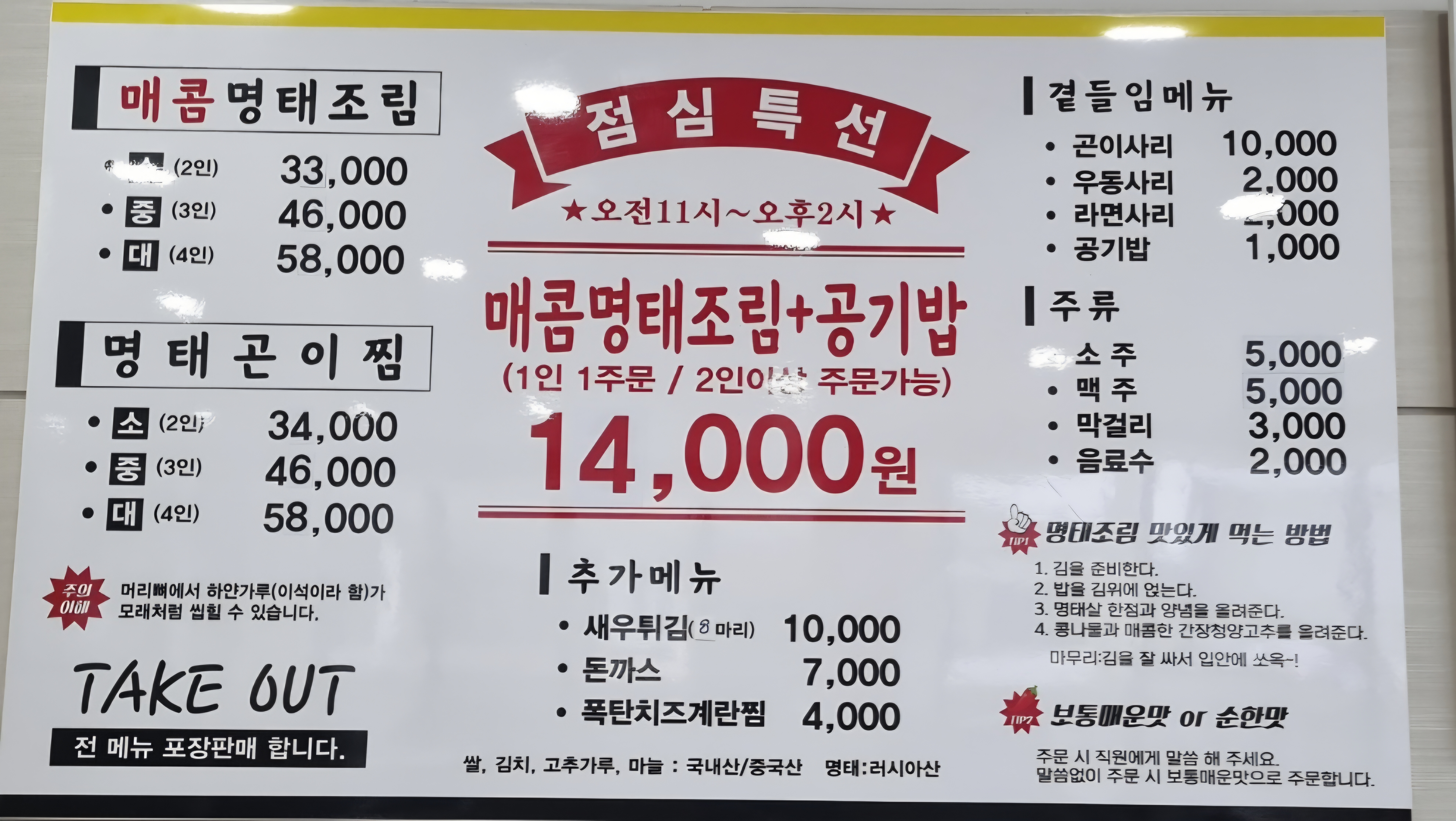 민초단 회원1. 여기 오신다면 점심특선으로 오시는걸 적극 추천합니다. 2. 치즈폭탄계란찜은 좀 비싸지만 평타였습니다. 3. 곤이사리 마넌인데 매우 맛있습니다. 적극추천드려요. 4. 내돈내산이고 또 올정도로(재방문의사 있음) 양도 충분하고 맛있습니다. / 리뷰적으면 주는건 없었고 제 자신이 매우 만족스럽고 맛있어서 리뷰남깁니다! 5. 단점으로는 화장실이 남녀 각각 한개뿐이고해서 사람들 많이 방문하고 다니고하는데 이용하는데에 불편가지는거 말고는 충분히 괜찮은 식당이라고 생각합니다.