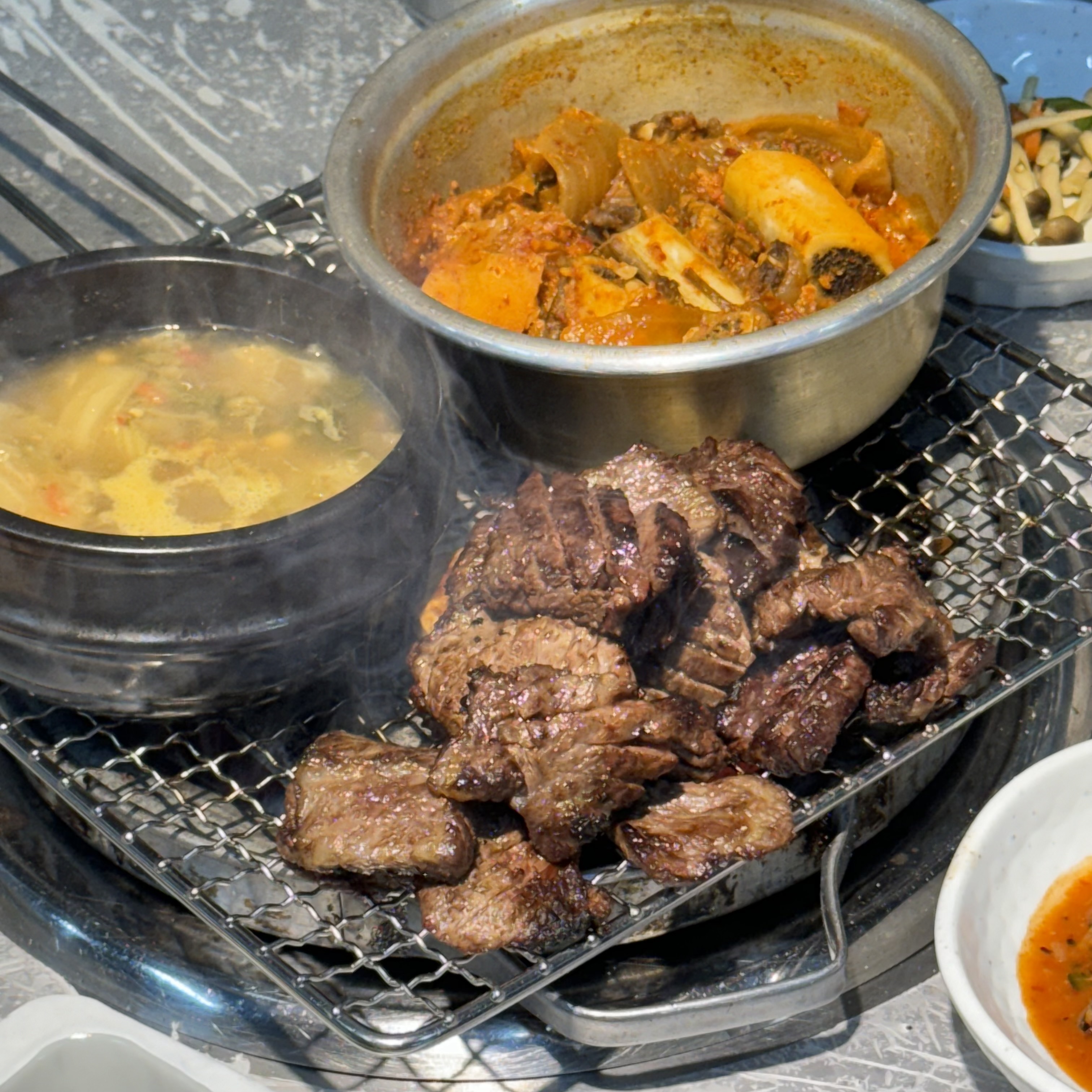 오랜만에 제대로 된 한우 숯불갈비 먹고 싶어서 방문했는데, 결론부터 말하면 **재방문 의사 100%**입니다. 일단 고기 퀄리티가 다 했어요. 숯불 위에 올리자마자 퍼지는 불향… 이 향 맡는 순간 이미 게임 끝. 마블링 적당히 올라간 한우 갈비가 숯불에 지글지글 익어가는데, 겉은 바삭하게 캐러멜라이징 되고 속은 촉촉하게 육즙이 살아있어요. 첫 점은 소금만 살짝 찍어서 먹었는데 와… 고소함이 확 올라오고 씹을수록 단맛이 올라옵니다.