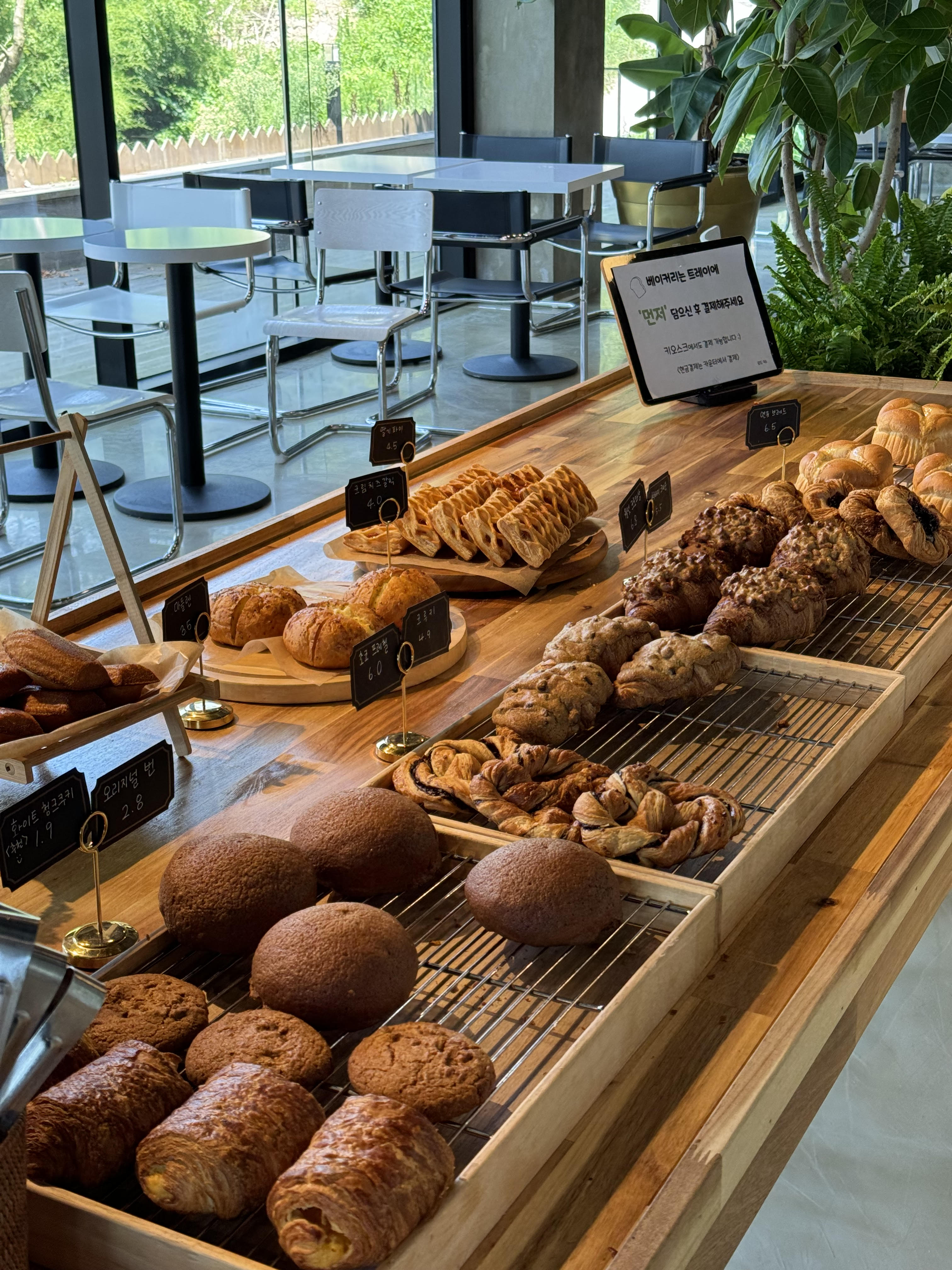 찐맛집매력✨️매력's 찐리뷰✨️ ✅️ 뷰만 멋지네요! ✅️ 빵맛은 별로 ✅️ 2층 케어키즈존, 케어안됨 뷰만 좋은 카페네요! 커피포함 38,000원.. 돈아까워서 최대한 먹으려했는데 싸가기도 싫은 맛. 서비스도 별로.. 일회용 포크와 일회용 나이프, 오더기주문에 저희가 말하기 전에 관심도 없음. 빵 저희가 가져가나요? 물어보니 그제서야 데워드릴까요? 라고 ... 다른분들은 쟁반 위 유산지에 그대로 두고 드셨나... 직원이 4명이 서있는데 그럴거면 4명이 있을 이유가 있나모르겠네요. 2층 갔다가 테이블에 물기, 빵부스러기 때문에 내려왔습니다. 네분이 수다 떠실 시간에 2층 테이블이라도 한번 더 닦고 정리라도 하시는편이 좋을 듯 합니다. 기대하고 찾았는데 많이 아쉬운 곳.