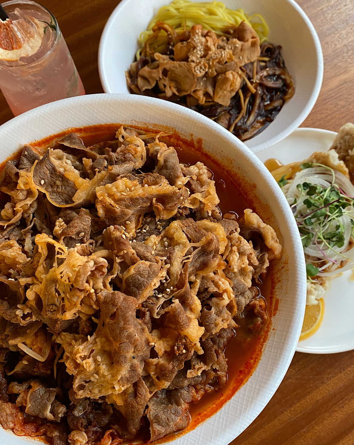 건강하게 행복할께주차할곳이 없어 가게 부근을 돌다가 12시쯤에 가게에 들어오니 입구 1인자리 3개만 남아 있었고 대기없이 앉을수 있었어요. 둘이서 꿔바로우탕수육 2인세트 주문했는데 양이 좀 많네요. 차돌짬뽕보단 전 알곤짬뽕이 더 입에 맛네요. 꿔바로우는 본인이 원하는 사이즈대로 잘라 먹을수 있게 집게와 가위를 가져다주시네요. 꿔바로우 찍어먹는 간장은 따로 없지만 소스에 찍어먹으니 간이 맞았어요. 슬라이스된 양파를 소스에 담궈 꿔바로우랑 같이 먹으니👍 셀프바엔 달걀볶음밥도 준비되어 있어 배가 고픈 사람들은 더 먹을수 있게 되어있고, 영수증 리뷰해서 받은 청포도 에이드는 탄산이 부족해 톡 쏘는 맛은 덜했지만 잘 먹었습니다.