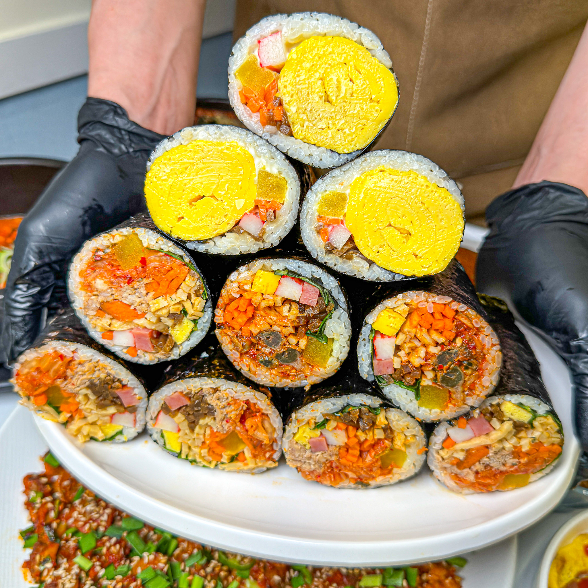 링롱김밥이 먹고 싶어서 찾아가본 강릉 교동김밥 강릉역에서 도보 10분 정도 중앙시장에서도 도보 10분 정도 걸렸다! 사거리에 있어서 눈에 띄는 간판 메뉴는 이러하다 우리는 시그니처인 꼬막김밥 6000원, 묵은지참치김밥 5500원, 라볶이 6500원 주문! 셀프라서 앞치마도 셀프로 가져오고 반찬(단무지, 김치)과 장국, 물도 셀프로 가져와야 함! 김밥은 생각보다 마는 시간이 걸리는지 일반 분식집들 보다는 좀 천천히 나온 느낌 위에가 꼬막김밥 밑에가 묵은지참치김밥 서울에서 먹는 묵은지참치김밥의 묵은지는 보통 하얗게 씻어서 넣는데 여기는 그냥 고춧가루 묻은 채로 써서 신기했다 꼬막김밥 위에는 꼬막이 올라가있고 김밥 안에도 꼬막이 가득가득 씹는 맛이 좋았다 내용물도 실하고...! 만족스러운 김밥들 그리고 나온 라볶이 고추장맛 많이 나는 라볶이 어묵, 떡, 라면이 골고루 들어있다 국물도 자박해서 김밥에 묻혀먹기도 좋고 떠먹기도 좋았던! 기차타기 전에 간단하면서도 맛있게 먹을 수 있는 교동김밥! 재방문의사 있음!
