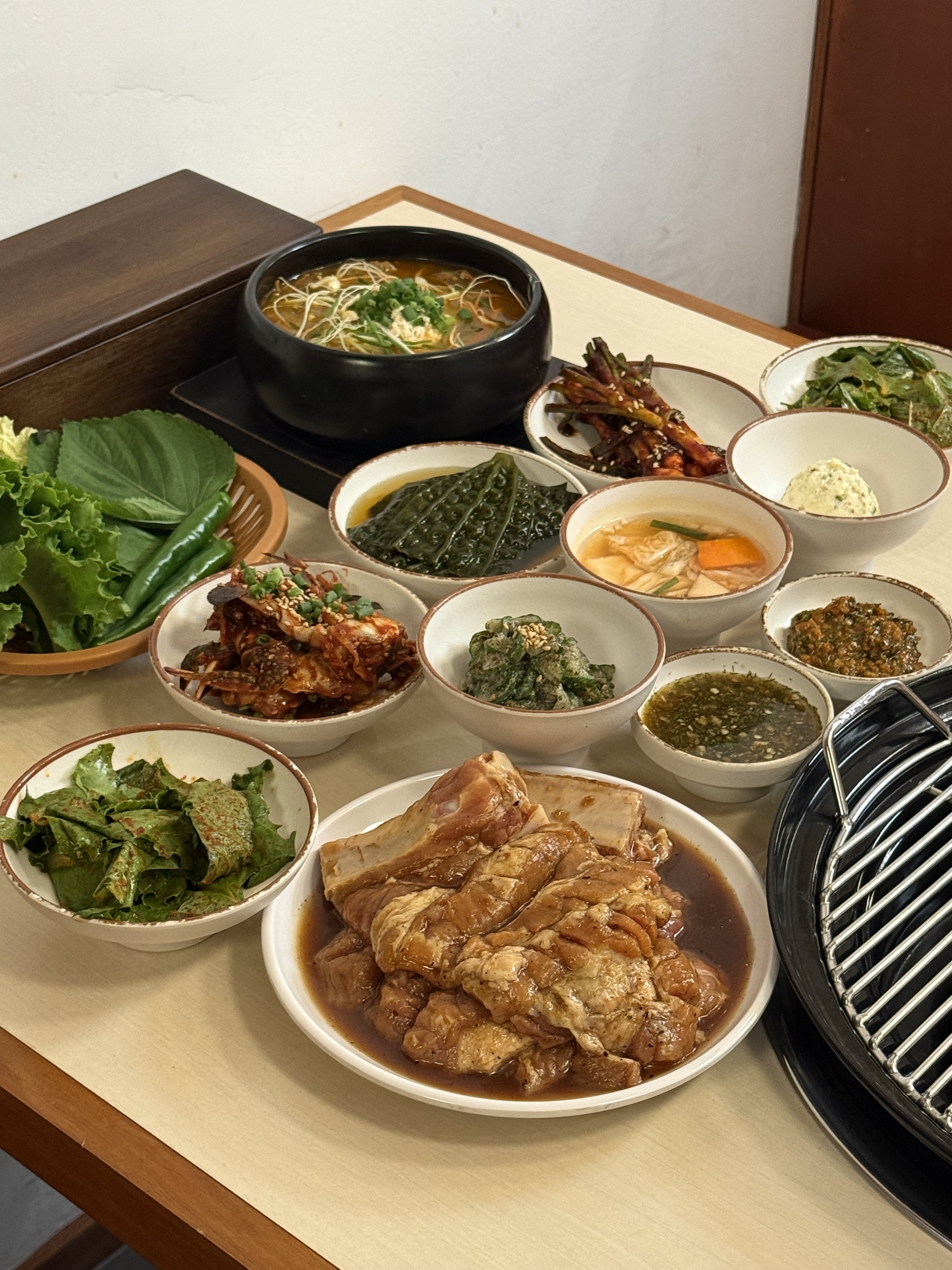 최리밤양념갈비가 넘 땡겨서 늦게까지 하는 집이 어디있니 찾아보다 왔어요 인테리어 한지 얼마 안됐는지 가게가 매우 깨끗하고 종업원분들이 친절하셔서 좋았어요~~ 고기 질도 아주 좋습니다 ㅎㅎ 다만 찬이 약간 부실한가..? 하다가도 먹다보면 고기와 맛이 잘 어울러져 아 이렇게 설계해서 만든 찬들이구나 싶었습니다~ 기본으로 나오는 콩나물국이 맛있었구요 저는 개인적으로 된장찌개가 취저였어요퓨ㅠㅠㅠ 약간 모랄까 대게딱지장 맛이 나서 대존맛...