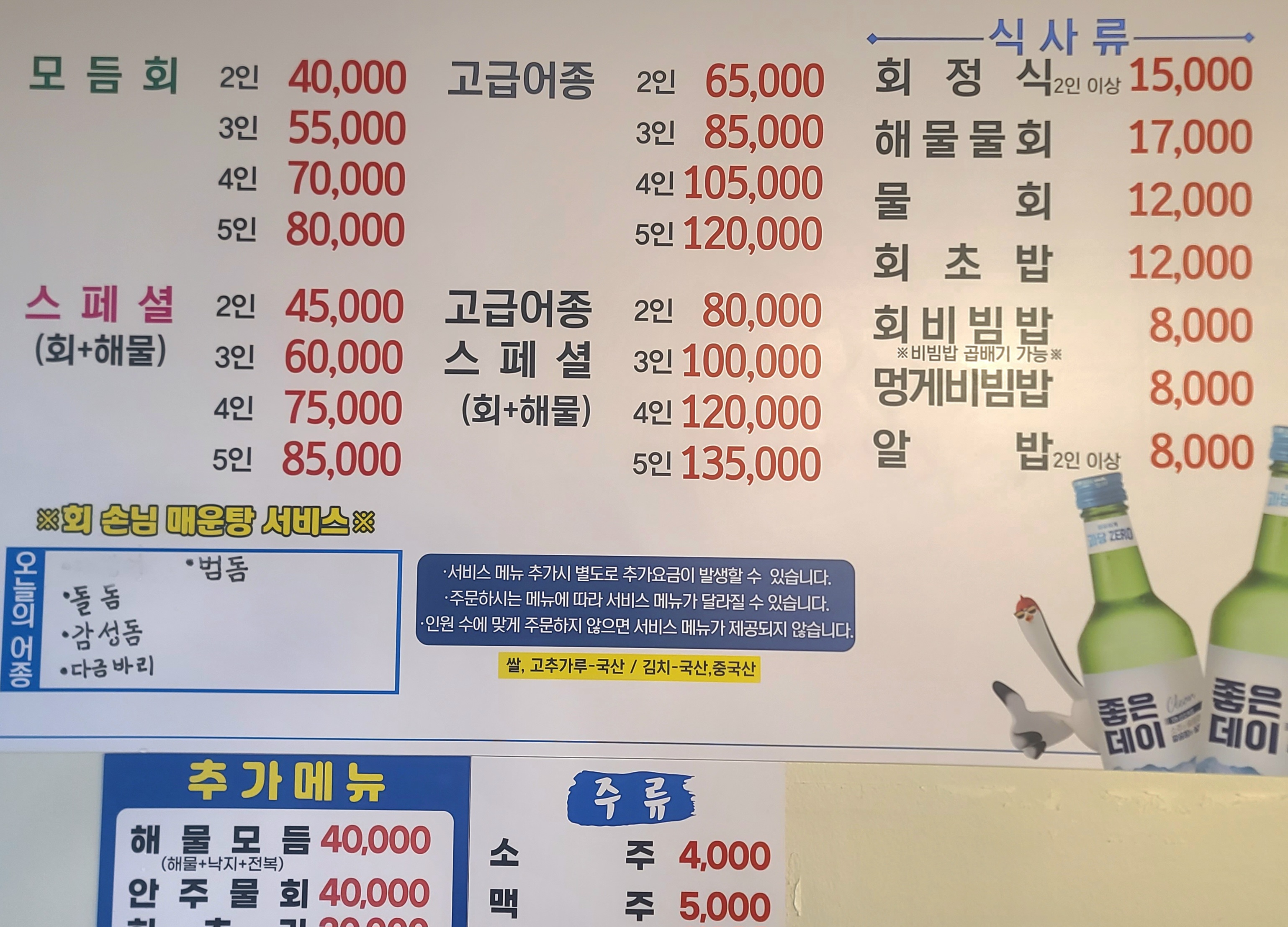 거누아범사하구 고성횟집 어버이 날을 맞아 양가 어머님들을 모시고 오랜만에 모임을 가졌다. 사하구에서 만남을 가지기로 했는데 어디 괜찮은 횟집이 없을까 알아보던 중 눈에 띄느 횟집이 하나 있다. 고성횟집이라고 이곳은 회비빔밥이 착한 가격이라 많은 사람들이 줄서서 먹는 횟집이었다. 우리는 회비빔밥 말고 모둠회와 함께 나오는 반찬이 잘 나오는 집으로 선택했기에 그 부분에 대해서는 신경쓰지 않았다. 이 곳에서 모임을 가지거나 모둠회가 어떻게 나오는지 궁금해하는 분들께 도움이 되는 포스팅이 되길 바라며 시작한다. 주문한 메뉴는 스페셜(회+ 해산물) 5인 95.000원 일인 1메뉴라서 초등학생도 1인에 포함 하는 곳이었다. 그래서 5인으로 주문을 하였다. 제일 먼저 상에 깔리는 반찬은 두부김치가 담긴 접시 하나와 삶은 옥수수, 콩, 새우가 담긴 접시하나 그리고 홍가리비 5개, 번데기, 비빔국수가 한접시가 놓였다. 홍가리비와 새우는 인원수를 고려하여 5개씩 나온것 같다. 비빔국수는 새콤달콤한 맛으로 식욕을 자극하기 충분했고 홍가리비는 소주하잔 하기 좋은 안주였다. 두부김치 역시 볶음김치에 싸먹으니 허기진 배를 달래기 좋은 안주였다. 먼저 나온 음식을 어느정도 먹고 있으니 곧이어 콘치즈와 계란찜이 나왔다. 계란찜은 작은 뚝배기가 아니라 큰 뚝배기여서 만족스러웠다. 그리고 새콤한 김치로 노릇하게 구운 김치전이 나와 입맛을 더 돋구어주었다. 김치전이 조금 더 컷으면 하는 바람도 있다. 너무 작아서 5인이 먹기엔 아쉬운 양이었다. 메인 음식이 나올때가 다 되었는지 푹 우린 미역국이 나왔는데 진국이라는 표현이 아깝지 않을 정도로 맑고 진했다. 해산물 등장 해산물은 낙지탕탕이와 개불, 멍게, 전복, 해삼 다섯가지가 회로 나왔다. 사진에 보이는것 처럼 양은 그렇게 많아 보이지 않는다. 멍게는 색을 보니 통영멍게인것 보였고 양은 두개 정도 넣은것 같다. 나머지 해산물은 한 마리씩 썰어서 나온듯 보였다. 갓 잡은 듯이 싱싱했지만 생각보다 해산물이 푸짐하진 않았다. 스페셜 모둠회 5인 등장 스페셜이라는 이름에 어울리지 않는 모둠회가 나왔다. 한접시에 담긴 어종은 농어와 광어, 강도다리 세종류가 나왔다. 접시에 담긴 고기의 양을 떠나서 세종류를 준다는 것이 내 상식에도 납득할 수 없었으며 어느 횟집을 가서도 이렇게 먹어 본 적이 없어 좀 당황스러운 부분이 있었다. 회는 진짜 갓잡은 듯한 활어회를 먹어서 활어의 참맛을 느낄 수 있었다. 요즘 손님이 많은 횟집을 가면 미리 회를 잡아 놓고 파는...