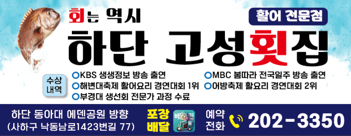민들레씨앗[ 하단 동아대맛집 고성횟집 ] 회식 모임장소로 추천 활어회에 스끼다시도 잘 나오고, 매운탕도 무료인 곳 사람도 북적북적한 맛집. 하단맛집 동아대횟집 고성횟집. ✔ 고성횟집 OPEN AM 11:30 CLOSE AM 12:00 브레이크타임 15:20~16:40 문의 051-202-3350 고성횟집은 살아있는 활어전문점. 2층 건물에 100석 이상의 매장이라서 단체예약도 가능해. 안으로 들어가봅니다. ✔ 분위기 1층 좌석에 이미 사람들이 있어서 2층으로 올라갔어. 문으로 나가면 외부에도 홀이 있어서 독립된 공간을 원하면 여기도 괜찮겠다 싶었어. 2층이 더 좋은데? 2층 첫손님이라서 너무 휑한가 했는데, 나중에 되니 꽉 차서 맛집은 맛집인가보다 했어. 내부에 화장실 있습니다. ✔ 메뉴 고성횟집의 메뉴로는 모듬회, 스페셜, 고급어종 등 회와 해물을 먹을 수 있고, 식사로 회정식, 물회, 회비빔밥, 멍게비빔밥을 먹을 수 있지. 겨울에는 대방어와 굴도 하고있어. 회를 주문하면 매운탕도 무료! 모듬회 2인을 주문합니다. 광어, 우럭, 밀치, 강도다리 등등이 나온대. SNS이벤트도 하고 있어요 먼저 스키다시 상차림. 횟집 스키다시 좋아하는데, 푸짐하게 나와서 이것만해도 안주로 충분했어. 김치전 맛나맛나. 오늘의 Pick! 모듬회 2인 ₩ 40,000 모듬회 등장. 윤기 촤라락 연어, 강도다리, 밀치, 우럭인가 광어인가..? 암튼..ㅋㅋ 초밥으로 먹을 수 있도록 4피스도 같이 나와. 두툼한 회 좋아하는데 생각보다 얇게 썰어 아쉬웠지만 회도 싱싱하고 쫄깃해서 맛있었어. 이날 4가지 어종 중 강도다리가 제일 쫄깃하고 맛있었어. 회킬러인 나는 다 맛있었지. 근데 매운탕을 못먹었네 ㅜㅜ 담에는 매운탕까지 먹고 말테당. 스키다시도 괜찮고 회도 맛있고 매운탕도 무료, 2층 공간도 넓어서 맘에 들었던 곳. 하단맛집 동아대횟집 고성횟집.