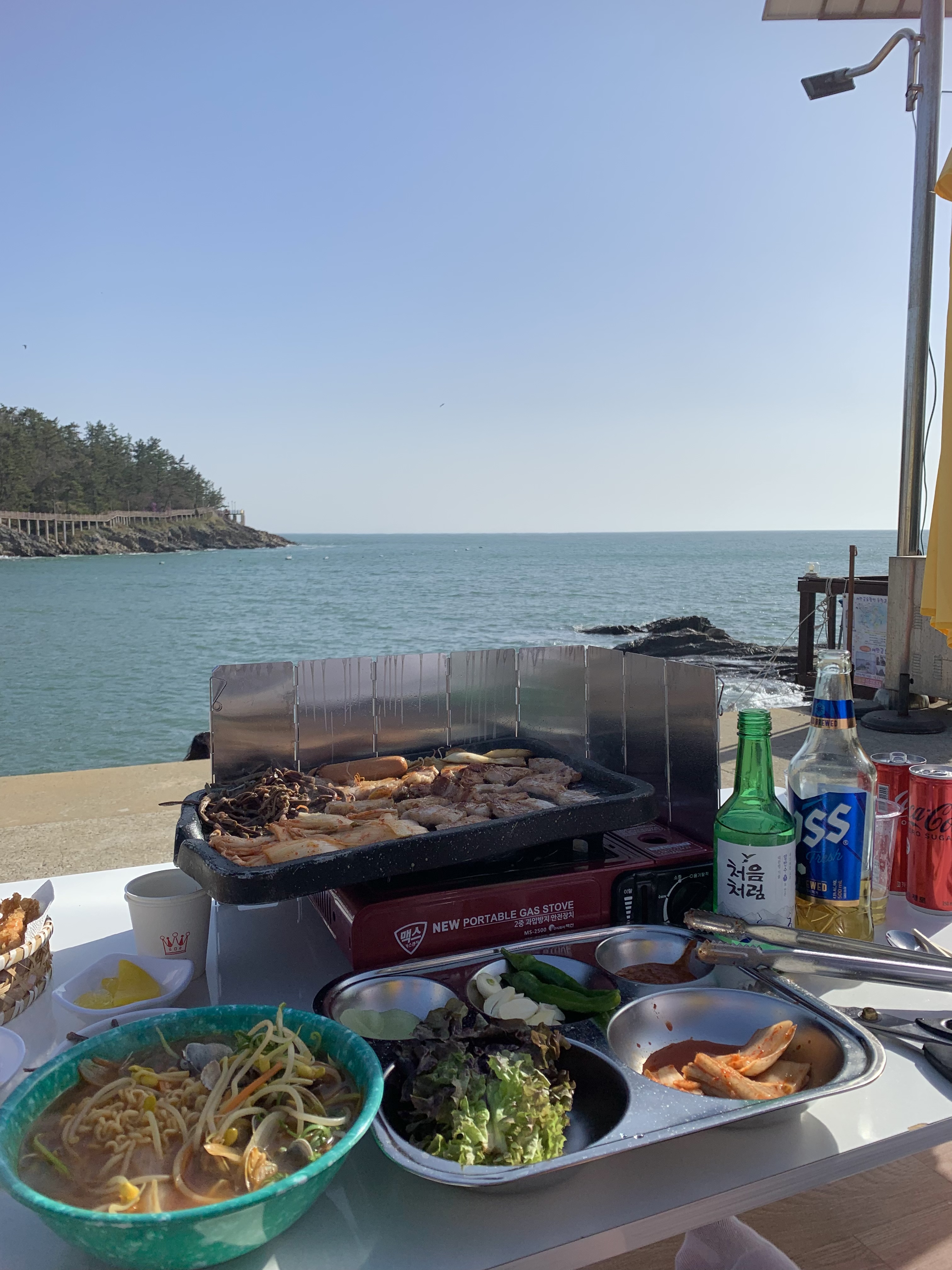 cute girl like me선유도에 위치한 옥돌슈퍼 식당점~♥️ 마을 공영주차장에 주차하기도 힘들고, 바닷가로 가는 쪽에 위치하고 있어 처음 찾아가기엔 조금 힘들었어요..^^;; 방문 시간이 브레이크타임과 겹쳐 오후 타임 대기 1번으로 들어갔는데 그 덕분에 야외테이블 중 마음에 드는 자리로 선택할 수 있어서 좋았습니다. 바다뷰를 바라보며 먹는 삼겹살도 맛있고, 바지락 라면도 맛있고 볶음밥도 맛있었어요. 욕심 부려서 주문하는 바람에 많이 남기고 왔지만, 전혀 아깝지 않을 정도로 너무~ 너무~ 만족스러웠던 곳~😍 탁 트인 바다 풍경과 반짝거리는 윤슬, 잔잔한 파도 소리, 흘러 나오는 노래들까지 완전 '나란여자' 스타일이라는 건 '안.비.밀'~🤭 오랫동안 기억에 남을 것 같아요~🥰 [📌 혹시, 군산여행을계획하고 있다면 꼭 가보세요]