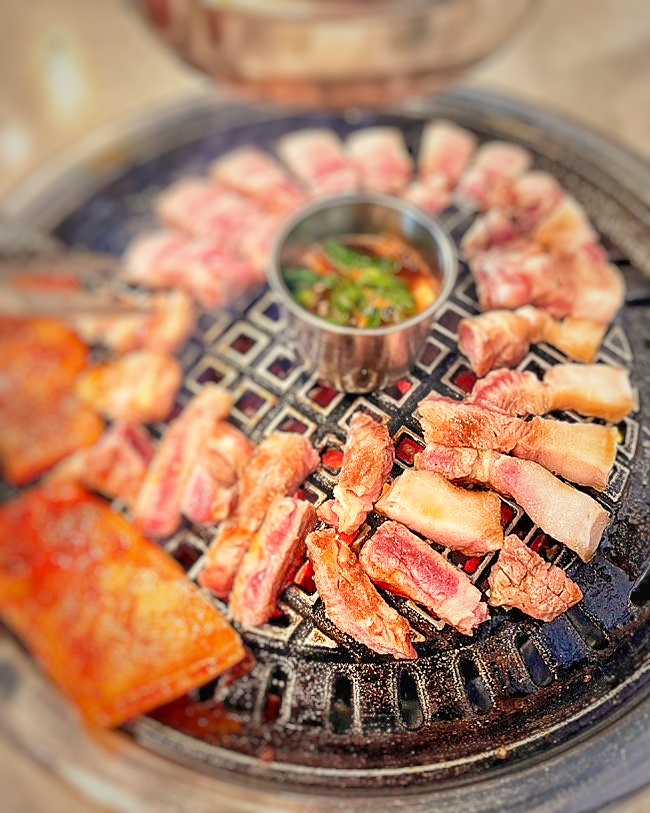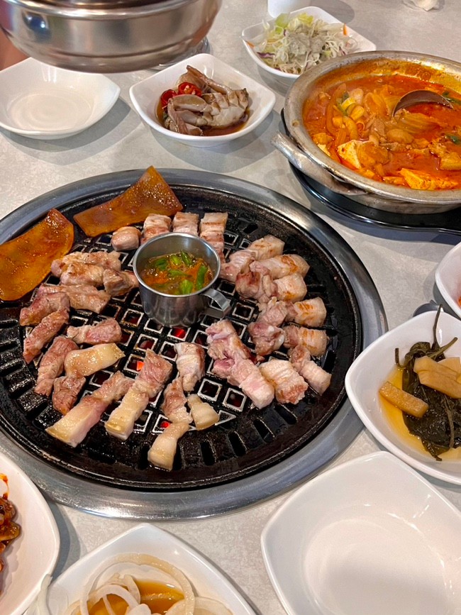 희큐리숙소 근처 흑돼지맛집을 검색하다 발견한 나영석 PD가 제주 오면 자주 간다는 봉순이네 흑돼지입니다. 앞 건물만 있는 줄 알았는데 뒷 건물도 넓게 있었어요. 잔디밭에서 먹는 테이블도 여러 개 있어요. 흑돼지 3인을 시켰습니다. 목살과 삼겹살이 나온다고 하네요. 반찬을 셀프 리필이 아니고 달라고 해야 해요. 게장으로 입맛을 돋구고 제주에 왔으니 흑돼지 먹어줘야죠~ 남은 한덩이를 올려놓는데 많이 아쉬웠어요ㅋ 김치찌개 칭찬글이 많은데 저희는 모두 된장찌개를 시켰어요. 된찌가 꽃게탕인줄~ 고기도 너무 맛있고 자리도 널직하고 살짝 파티션이 있고 해서 쾌적하였습니다.^^