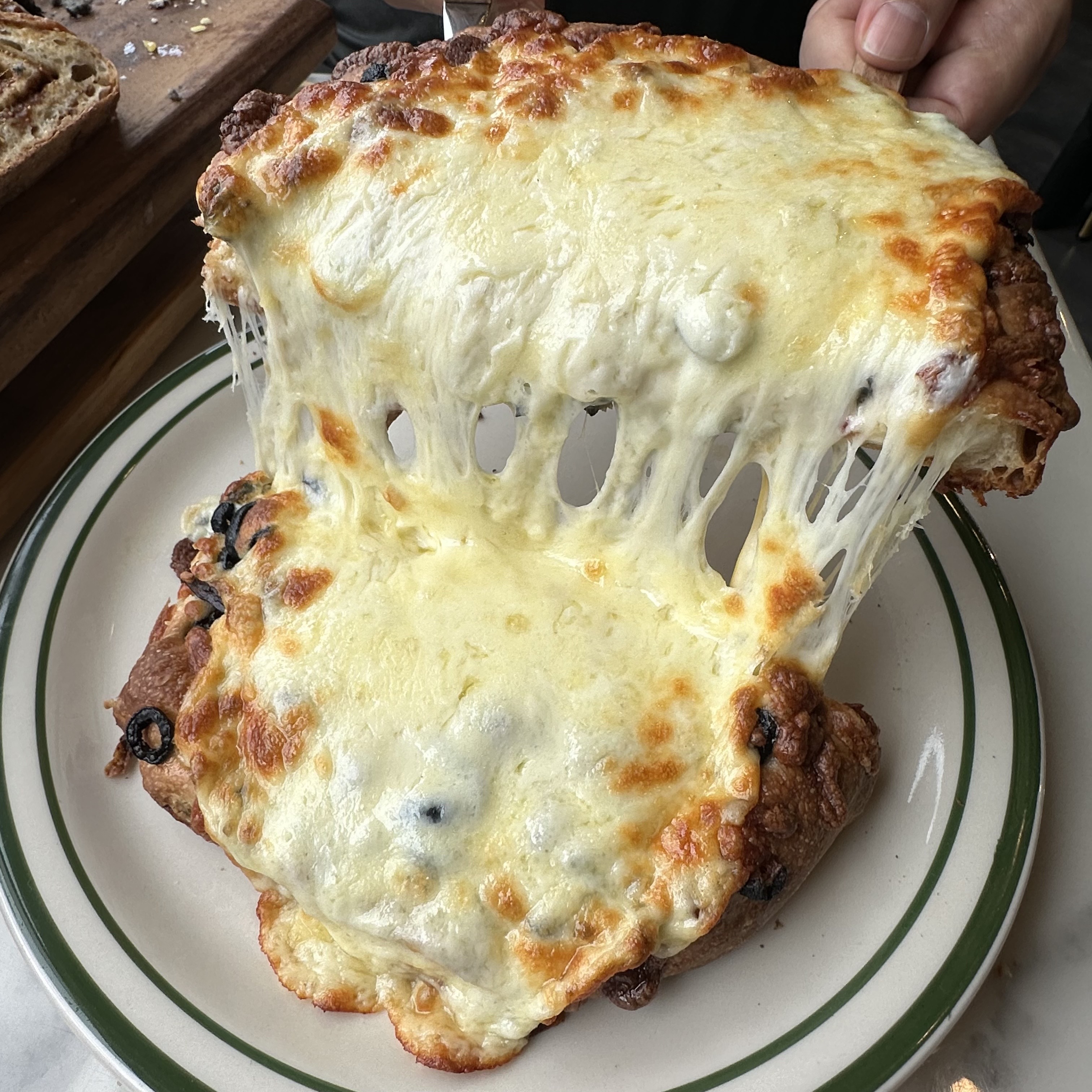 쏭푸안녕하세요 쏭앤푸드 입니다 이번 주말에는 고소하고 담백한 빵이 머릿속에서 떠나질 않아 평소 눈여겨보던 빵집으로 지체 없이 향했습니다. 오늘 소개해 드릴 곳은 바로 엄청난 재료 인심으로 유명한 송도 베이커리 율교입니다. : 인천 연수구 해돋이로 171번길 9-4 121호 : 0507-1429-3120 : 건물주차가능 ⏰: 수 목 금 토 10시30분~21시 일 월 화 휴무 주말 오후 율교 베이커리 매장 외부 모습입니다. 얼마전 확장이전하여 깔끔하고 모던한 외관이 멀리서도 눈에 잘 들어옵니다. 유리창에 쓰인 로고가 방문객들을 반갑게 맞이해 줍니다. 이곳은 브런치와 카페 베이커리를 겸하고 있어서 송도 현지인들 사이에서도 빵지순례 필수 코스로 손꼽히는 곳입니다. 올리브가 듬뿍 들어간 치아바타가 특히 유명하다는 소문을 듣고 그 맛을 직접 확인하기 위해 방문했습니다. 매장 안으로 들어선 순간 엄청난 인파에 깜짝 놀라고 말았습니다. 주말이라 어느 정도 사람을 예상하기는 했지만 발 디딜 틈 없이 매장을 가득 채운 손님들을 보니 이곳의 뜨거운 인기를 단번에 실감할 수 있었습니다. 계산을 기다리는 줄이 길게 늘어서 있었고 매장 한쪽에서는 쉴 새 없이 빵이 구워져 나오고 있었지만 진열대의 빵들은 무서운 속도로 사라지고 있었습니다. 빵이 다 팔렸을까 봐 조마조마한 마음으로 매대를 살펴보던 중 제 눈을 의심하게 만드는 순간이 찾아왔습니다. 제가 이곳에 온 유일한 목적인 올리브 치아바타가 기적처럼 딱 하나 남아있었던 것입니다. 정말 운이 좋게도 마지막 남은 하나를 무사히 쟁반에 담을 수 있었습니다. 올리브치아바타 8,800원 종이 포장지 사이로 삐져나온 거뭇거뭇한 올리브와 노릇하게 구워진 빵의 표면이 보기만 해도 먹음직스럽습니다. 겉면은 바삭하게 구워져 있고 그 위로 치즈가 녹아내린 흔적이 남아있어 그 맛이 무척 기대되었습니다. 집으로 돌아와 부푼 마음을 안고 치아바타를 반으로 잘라보았습니다. 단면을 확인하는 순간 저도 모르게 탄성이 터져 나왔습니다. 빵 반죽보다 까만 블랙 올리브가 더 많은 자리를 차지하고 있을 정도로 재료가 아낌없이 듬뿍 들어가 있었습니다. 빵 사이사이에 고소하고 부드러운 치즈가 함께 녹아들어 있어서 올리브의 빈틈을 완벽하게 채워주고 있습니다. 시중에서 파는 일반적인 치아바타와는 감히 비교조차 할 수 없는 압도적인 비주얼입니다. 큼지막하게 썰어낸 조각을 손으로 집어 들었는데 빵 속이 꽉 차 있어서 묵직한 무게감이 고스란히 전해졌습니다. 한 입 크게 베어 무는 순간...