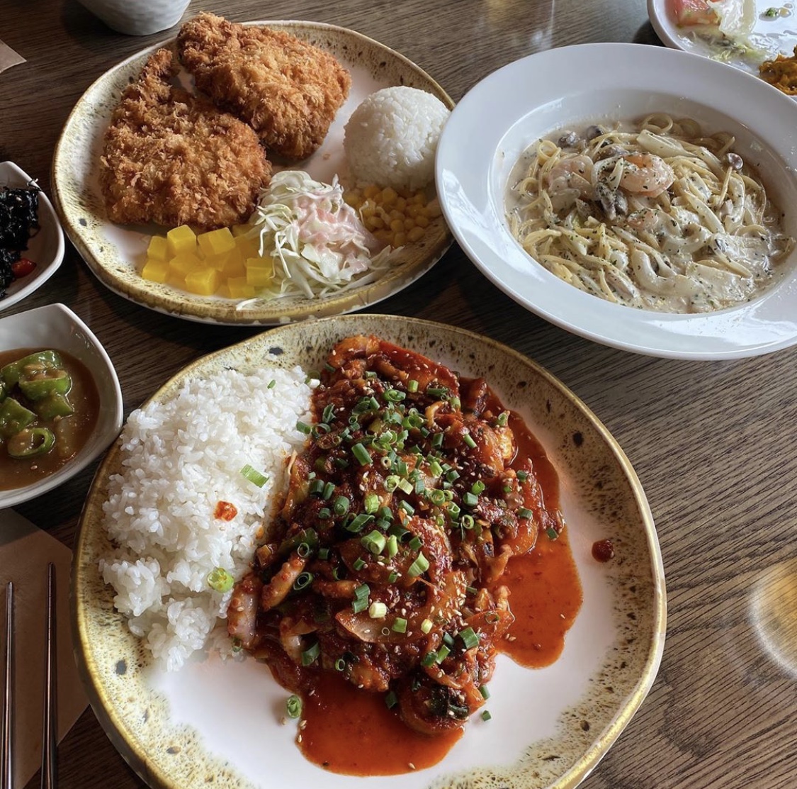 플랫화이트i부모님 모시고 가기 좋은 분위기였어요! 해물덮밥에 돈까스, 샐러드바의 신선한 샐러드와 과일까지 맛있는 점심이었습니다. 😋
